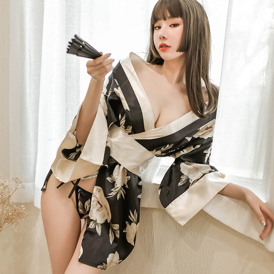 Japanese Sakura Girl Kimono Sleepwear Deep V-neck Satin Floral Printed Nightwear Bath Robe Costume