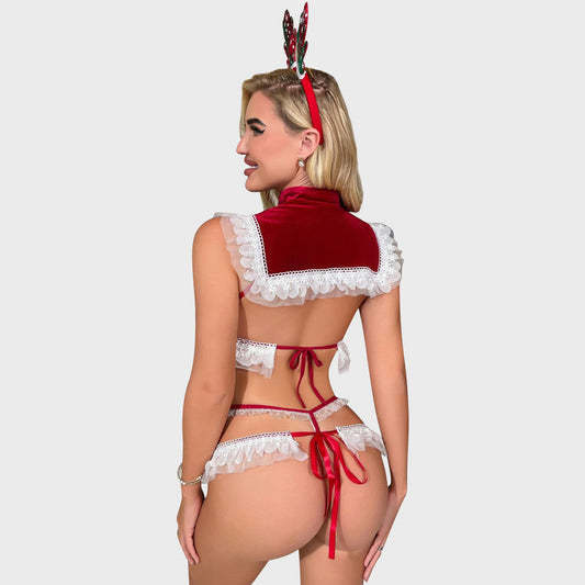 Sexy Christmas Lingerie Set Mrs Santa Claus Cosplay Outfit 3 Piece Red Velvet Bra Set