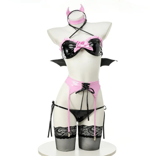 Sexy Devil Cosplay Lingerie Women Hollow Out Leather Underwear Top Wing Panty Set Anime Demon Bandage Bodysuit Halloween Costume