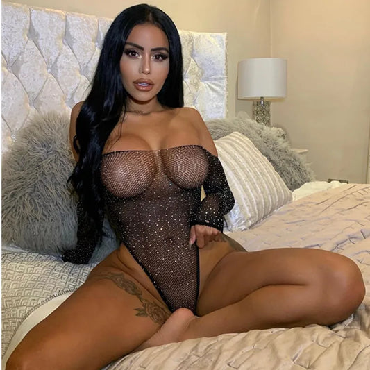 Sexy Fishnet Bodysuit See-Through Mesh Tight Women's Sparkling Rhinestone Body Socks Open Off Shoulder Sexy Fishnet Body Socks