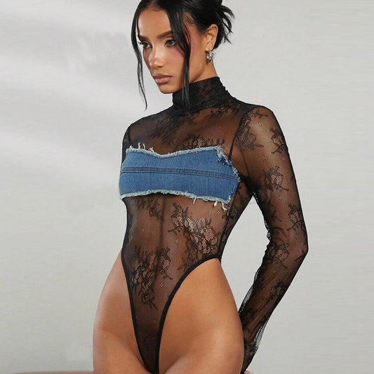 Sexy Long Sleeve Turtleneck See-through Denim Lace Color Matching Jumpsuit
