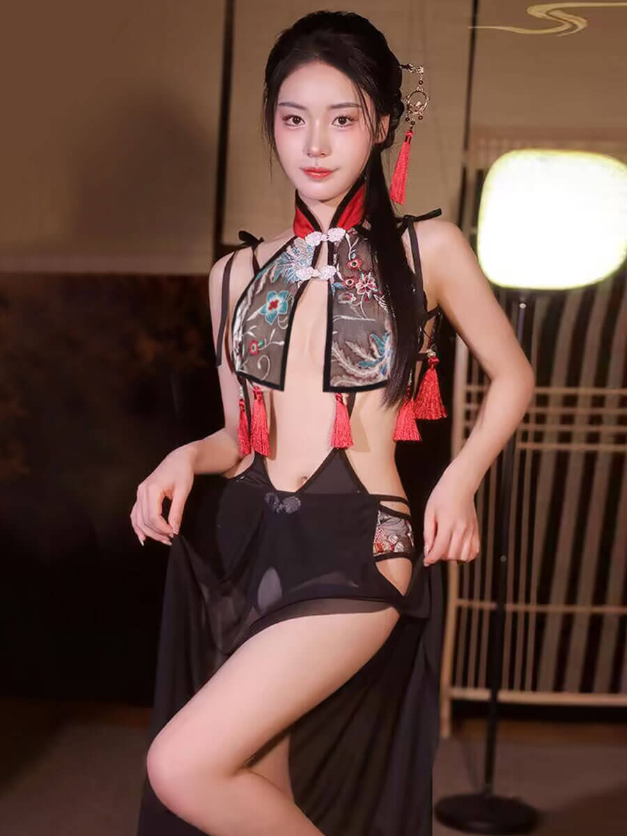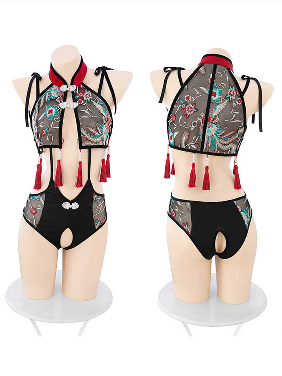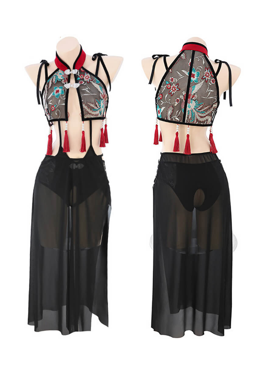Design: The unique design of the seductive cheongsam teddy lingerie, stand-up collar with retro buckle detailing, allover floral embroidery, underbust tassel accent, an open bodice and open crotch, a matching sheer mesh skirt with sides high slit hemline.