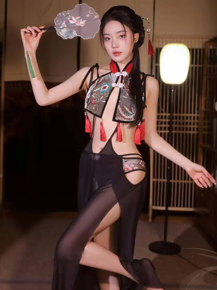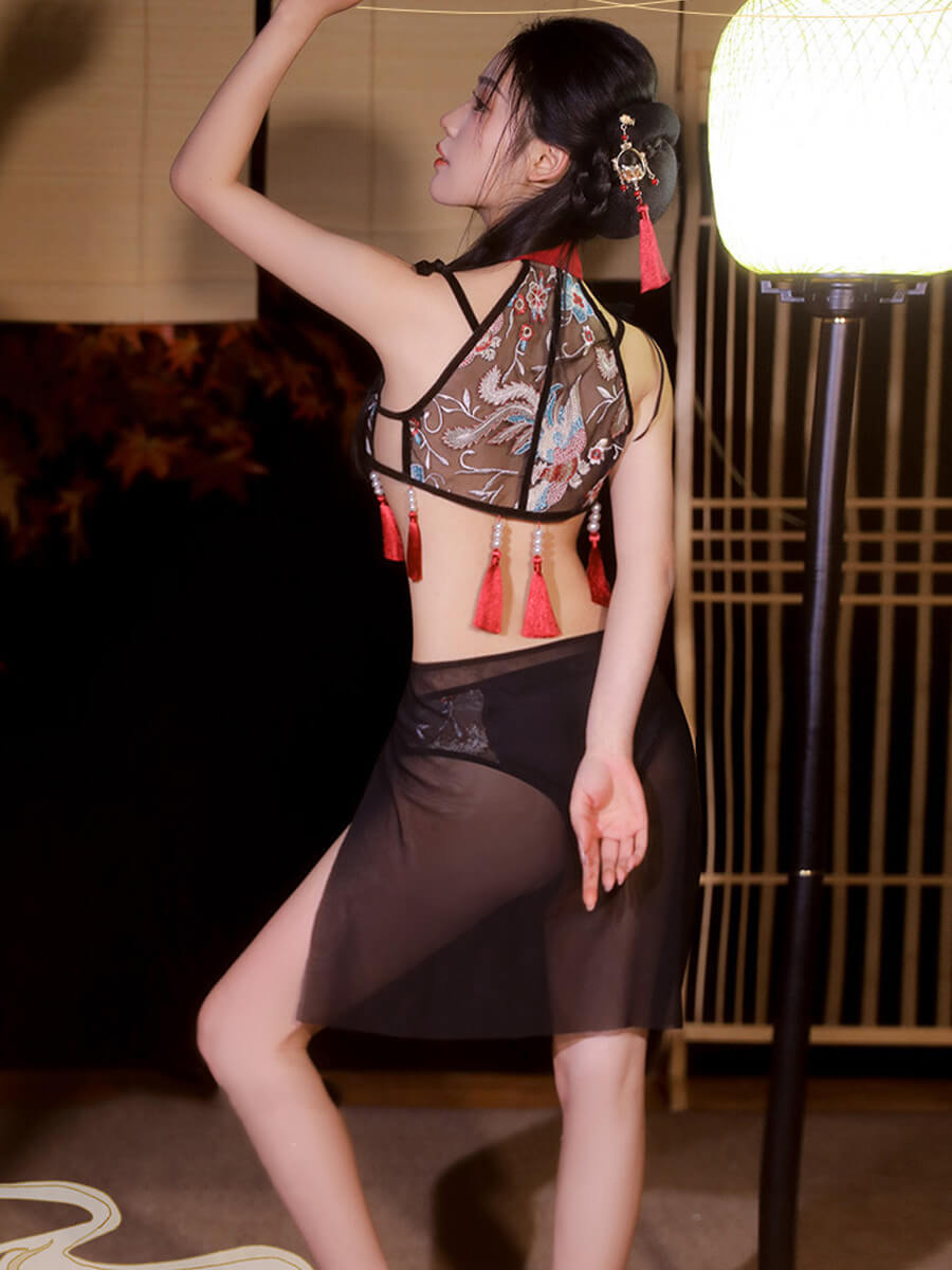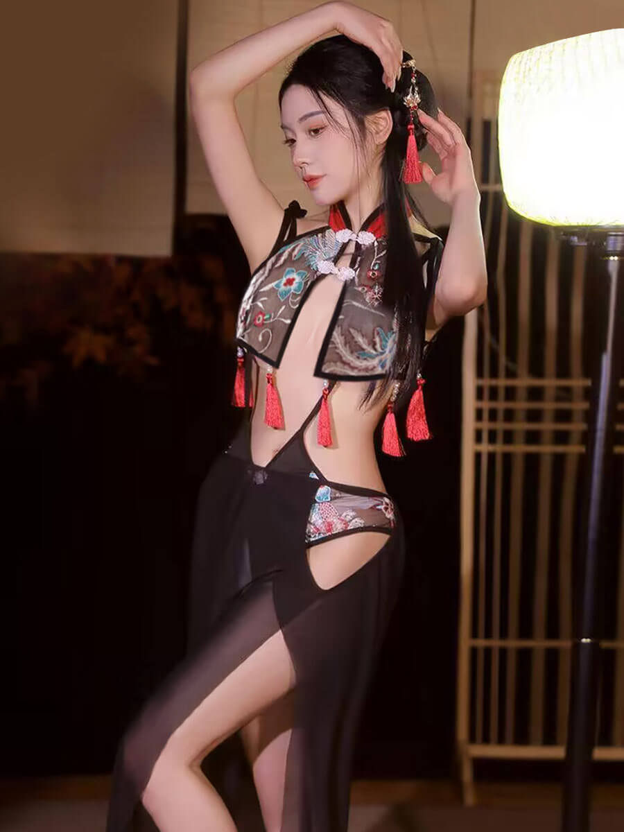 Design: The unique design of the seductive cheongsam teddy lingerie, stand-up collar with retro buckle detailing, allover floral embroidery, underbust tassel accent, an open bodice and open crotch, a matching sheer mesh skirt with sides high slit hemline.
