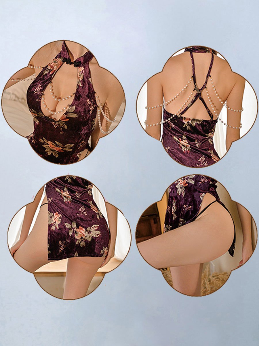 Design: Sexy Chinese Cheongsam Lingerie is designed with velvet mini dress with an allover floral details, pearl chain accents, traditional chinese collar with a keyhole, and high slit hemline. No restraints on chest with narrow bralette design, and the mini dress are definitely fit on your body curves outline. It makes you more attractive, charming, fashion and chic.