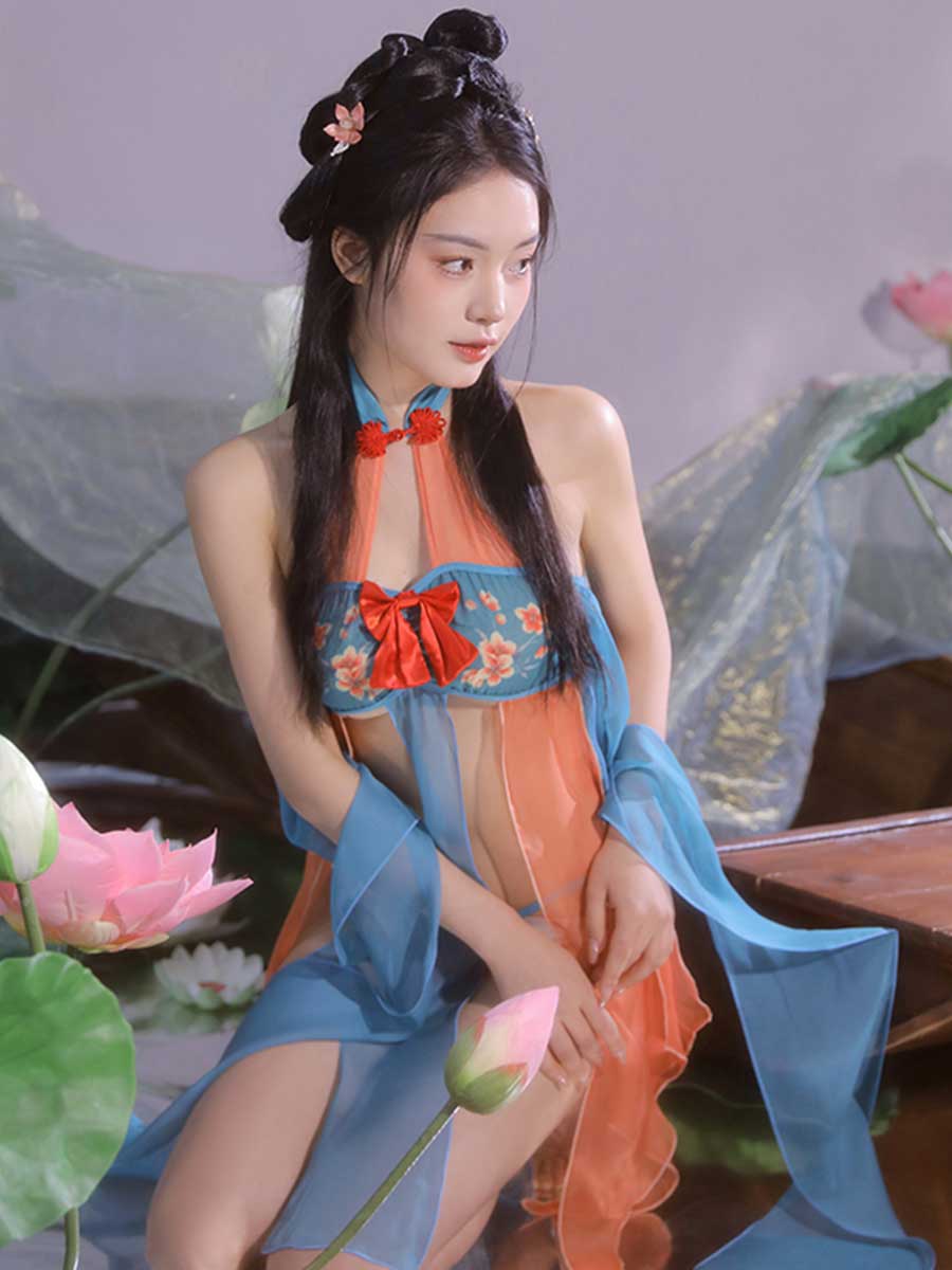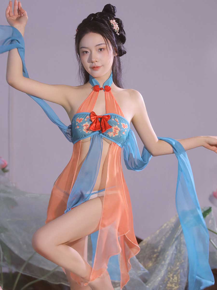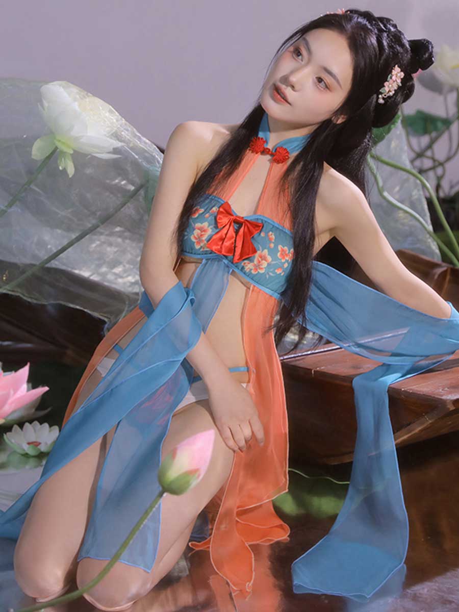 Design: This Exotic Stripper Lingerie Set featuring a mesh halter dress with draping panels, front red bow accents, floral printed, and matching arm drapes.
