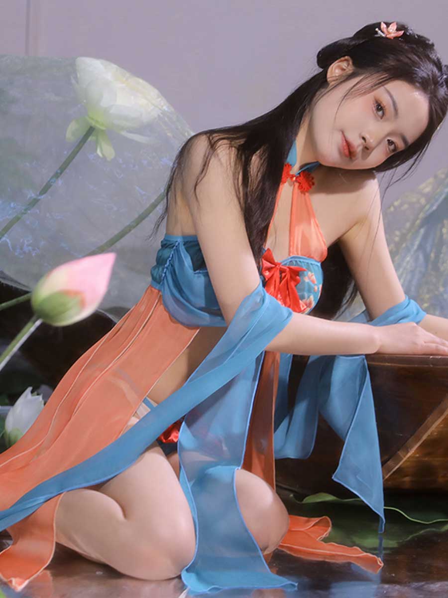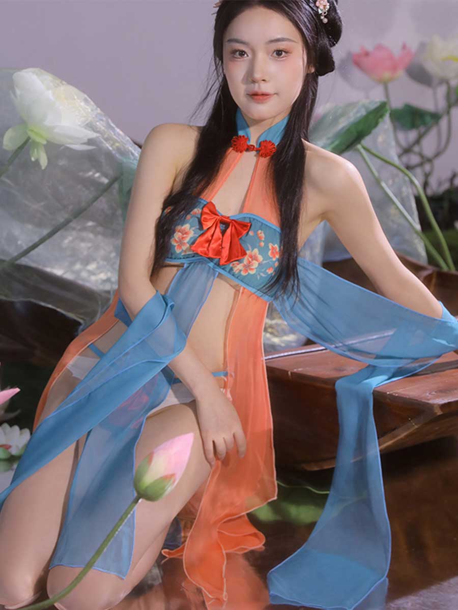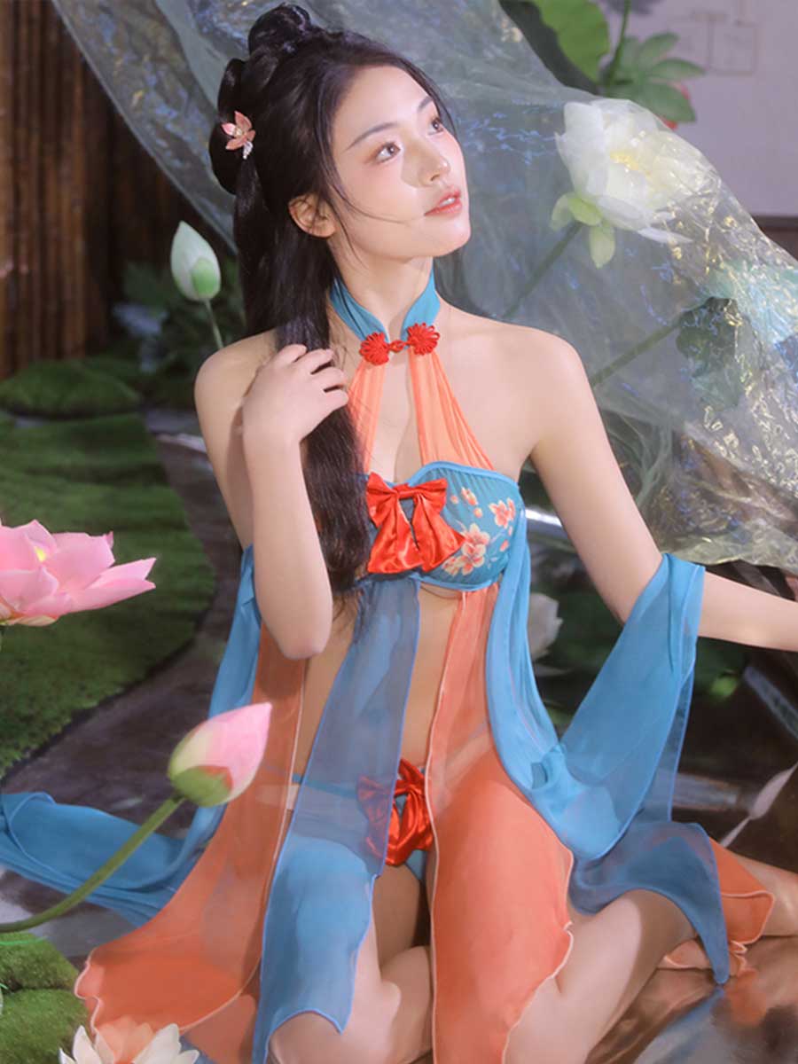 Design: This Exotic Stripper Lingerie Set featuring a mesh halter dress with draping panels, front red bow accents, floral printed, and matching arm drapes.