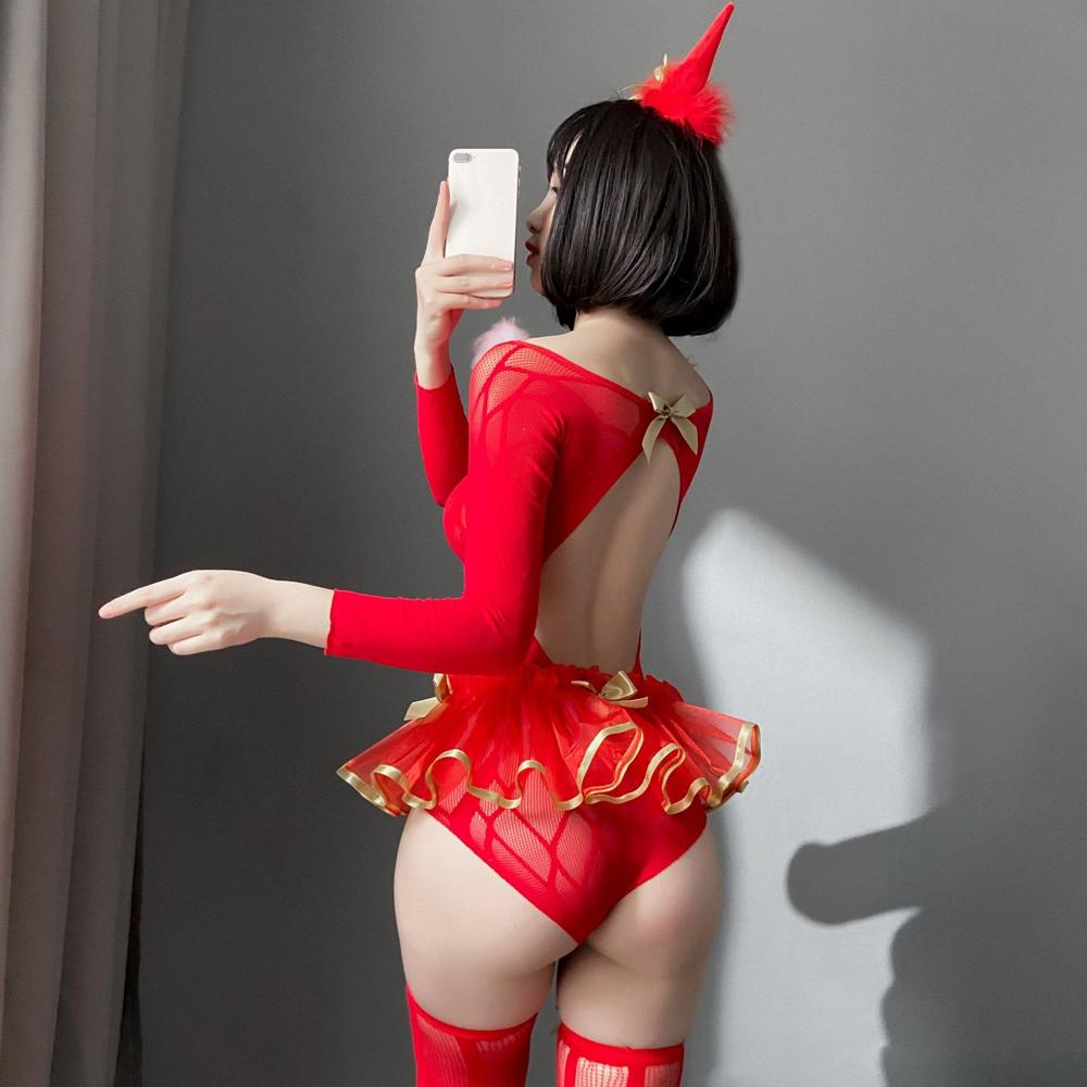 - Design: The red santa bodysuit featured a mesh top with cute fluffy feather trim, long sleeve, gold bow decor, cutouts on the back, making you look more sexy and charming. The bottom of the bustier top is an fluffy short mesh skirt consist and a thong cut back;
