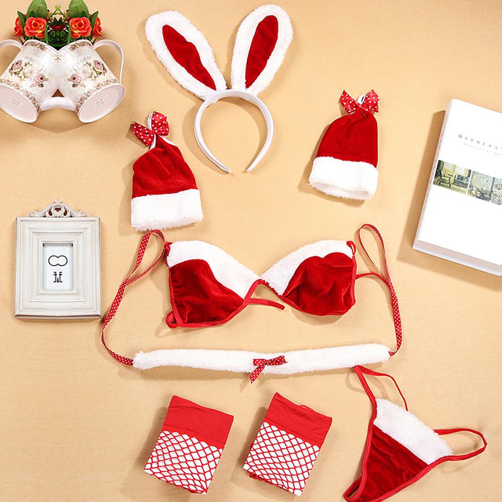 Christmas Bunny Cosplay Lingerie Set Kawaii Anime Micro Bikini Costume Red Velvet Bra and Panty