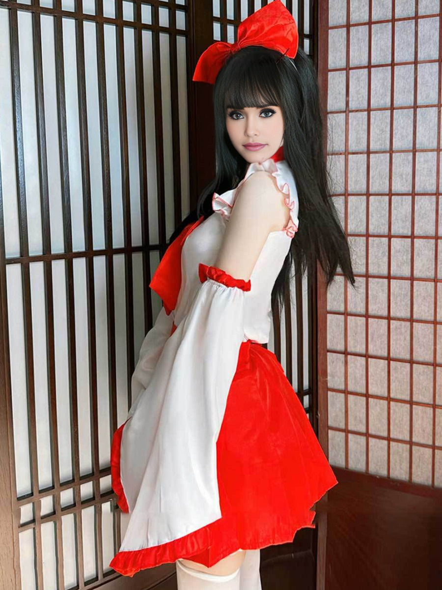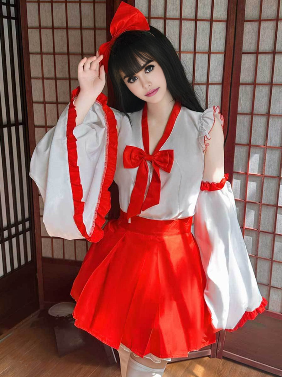 Design: The red mini skirt and white kimono top has been traditional for the Shrine Maiden. White kimono top with the red detailing features cold shoulder, red ruffled trim, long flared sleeve, and a matching pleated mini skirt will make you sexy, cute and attractive.