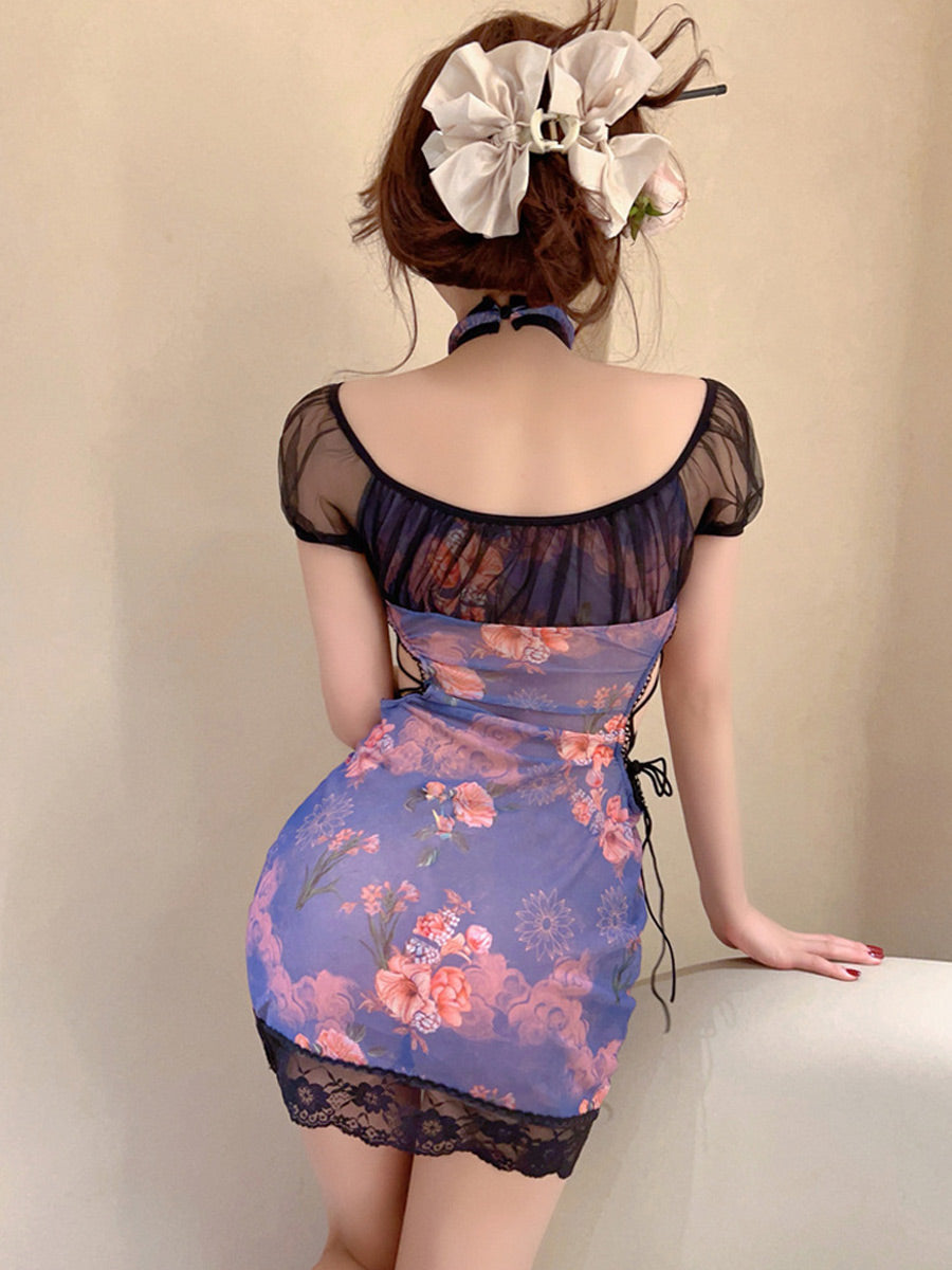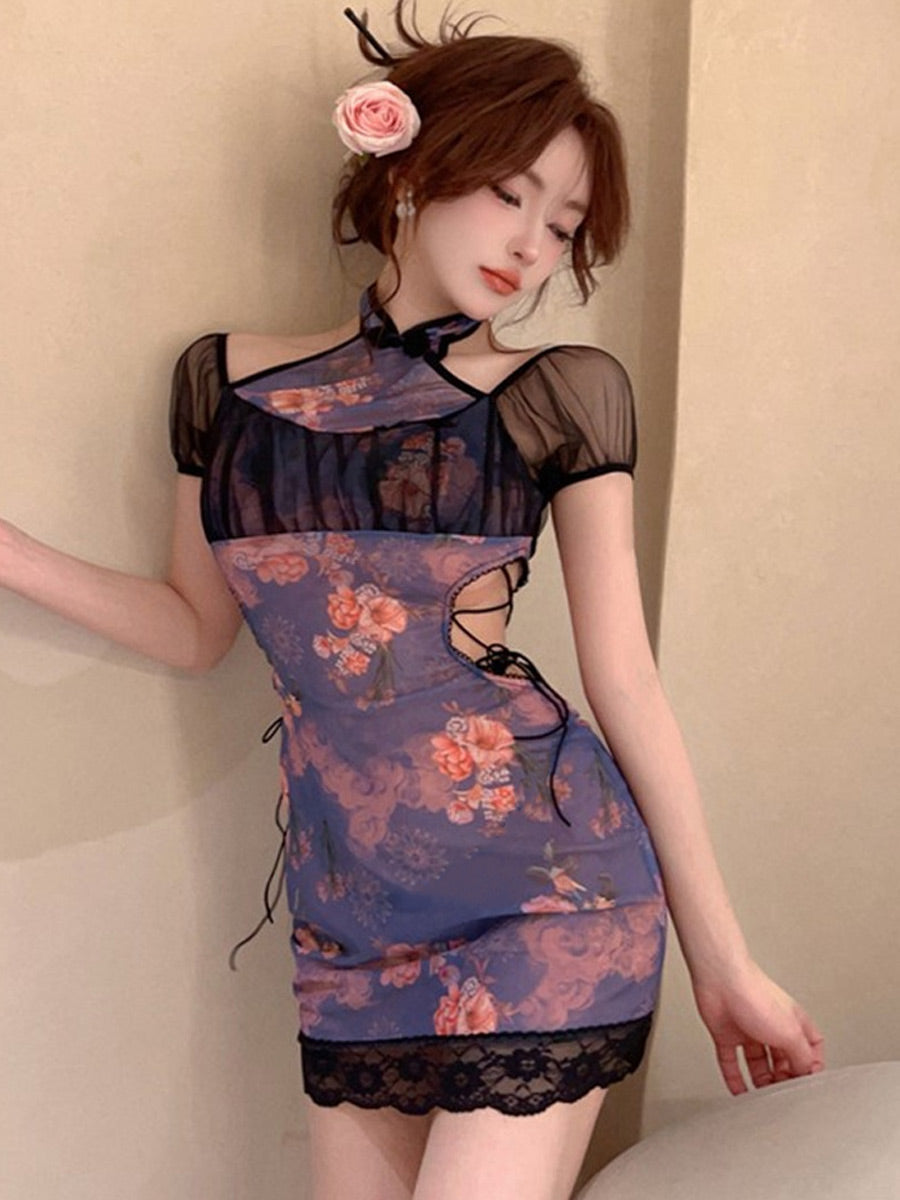Design: Chinese cheongsam featurings allover sheer mesh fabric with classic retro stand collar, traditional chinese buckle, cold shoulder sleeves, sexy side lace-up design allow it to fit more sizes, black lace hemline and the length of the cheongsam can't completely cover the buttocks, which is extremely sexy. It's designed to hug every curve with a playful blend of modern sensuality and timeless elegance.