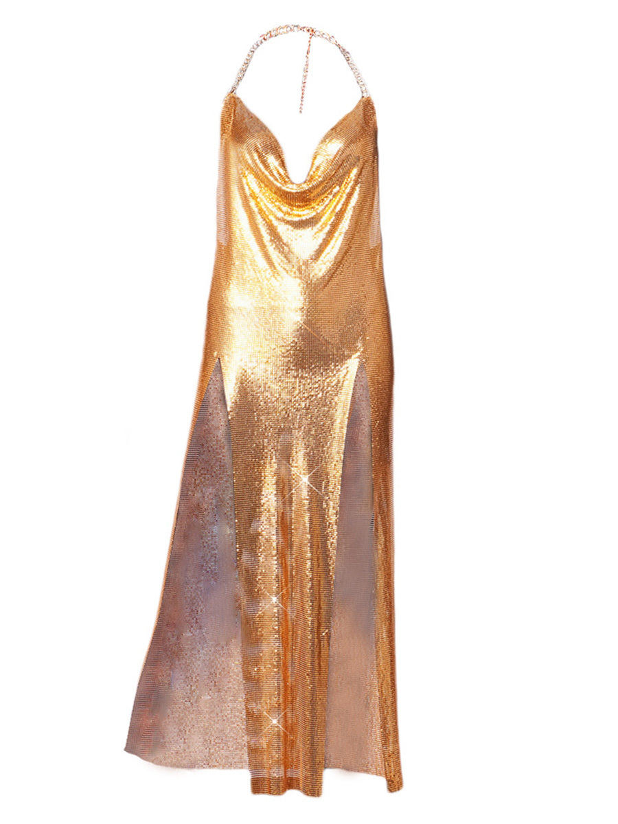 Design: Yomorio Chainmail Dress features with a backless design and a metallic sheen, a cowl neckline and sides slit hem add a touch of elegance and ensure a flattering, figure-hugging fit. Elevate your night out wardrobe with this statement piece.