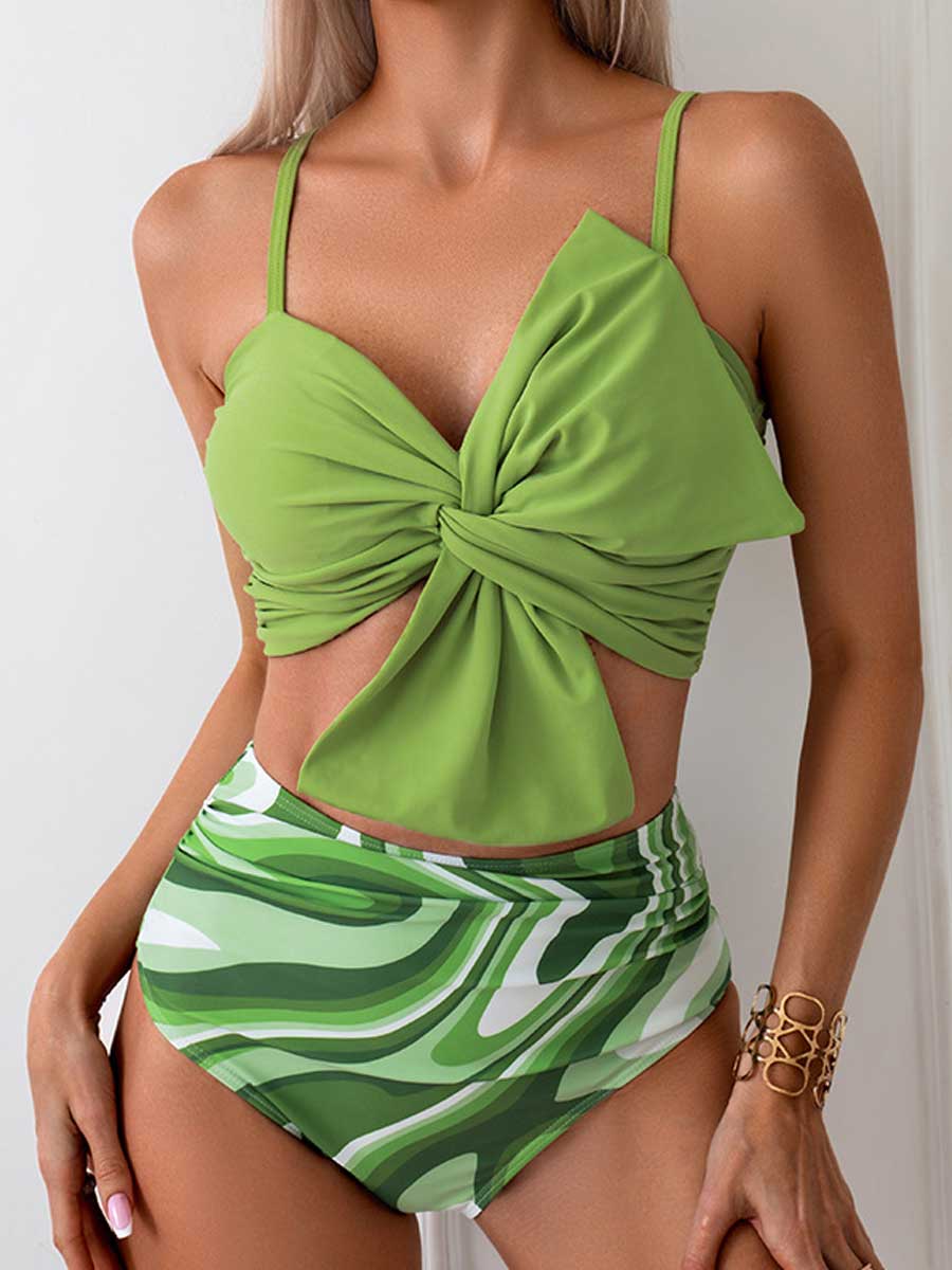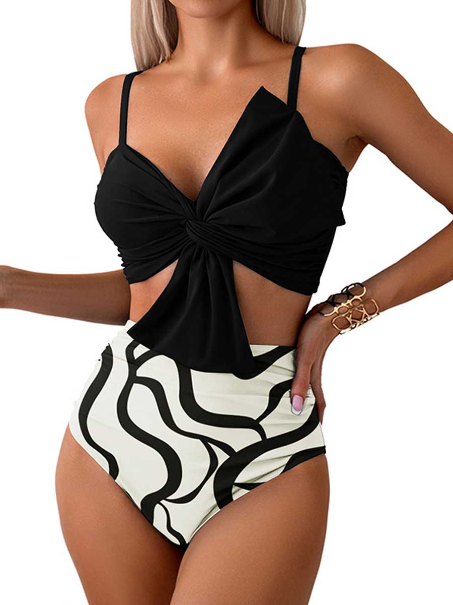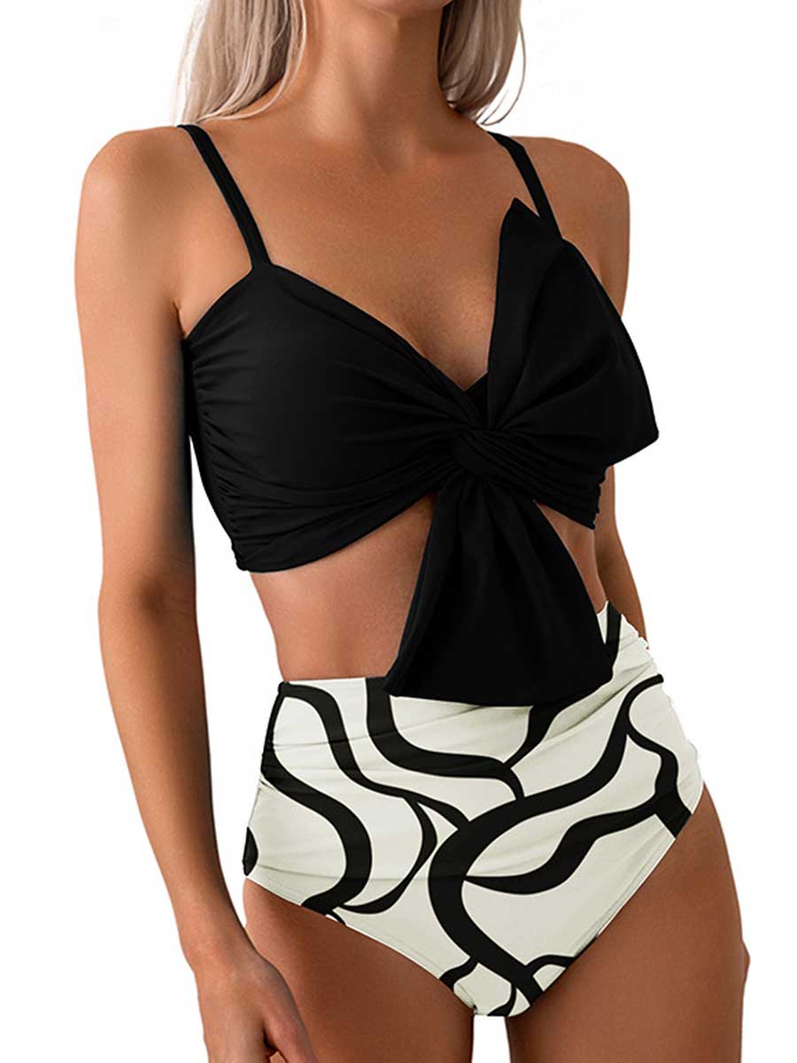 Design: 2 Piece Bikini Set: They have a longline bikini top, features soft padded cups, large bow on the front, adjustable spaghetti straps, and has drawstring tie detail. With high waisted bikini bottom featuring an allover 3D print, and a cheeky cut back.