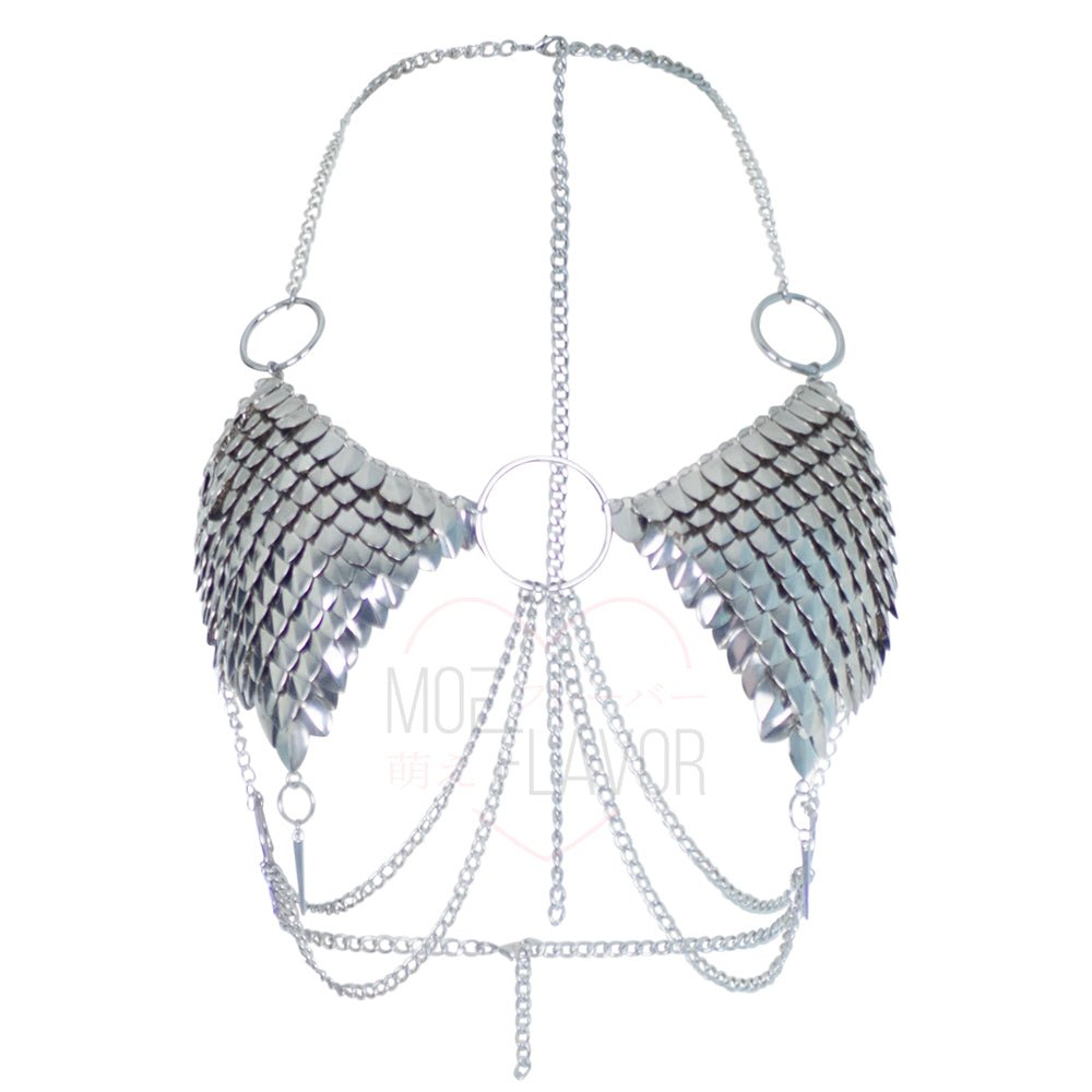 Step into your power and slay in style with our Iron Maiden Top / Skirt. Featuring sleek metal scales on top and a shimmering drape of silver rings for the bottoms, this outfit is equal parts warrior goddess and runway rebel. Designed for the bold and worn by the brave - this is the fantasy-core main event.