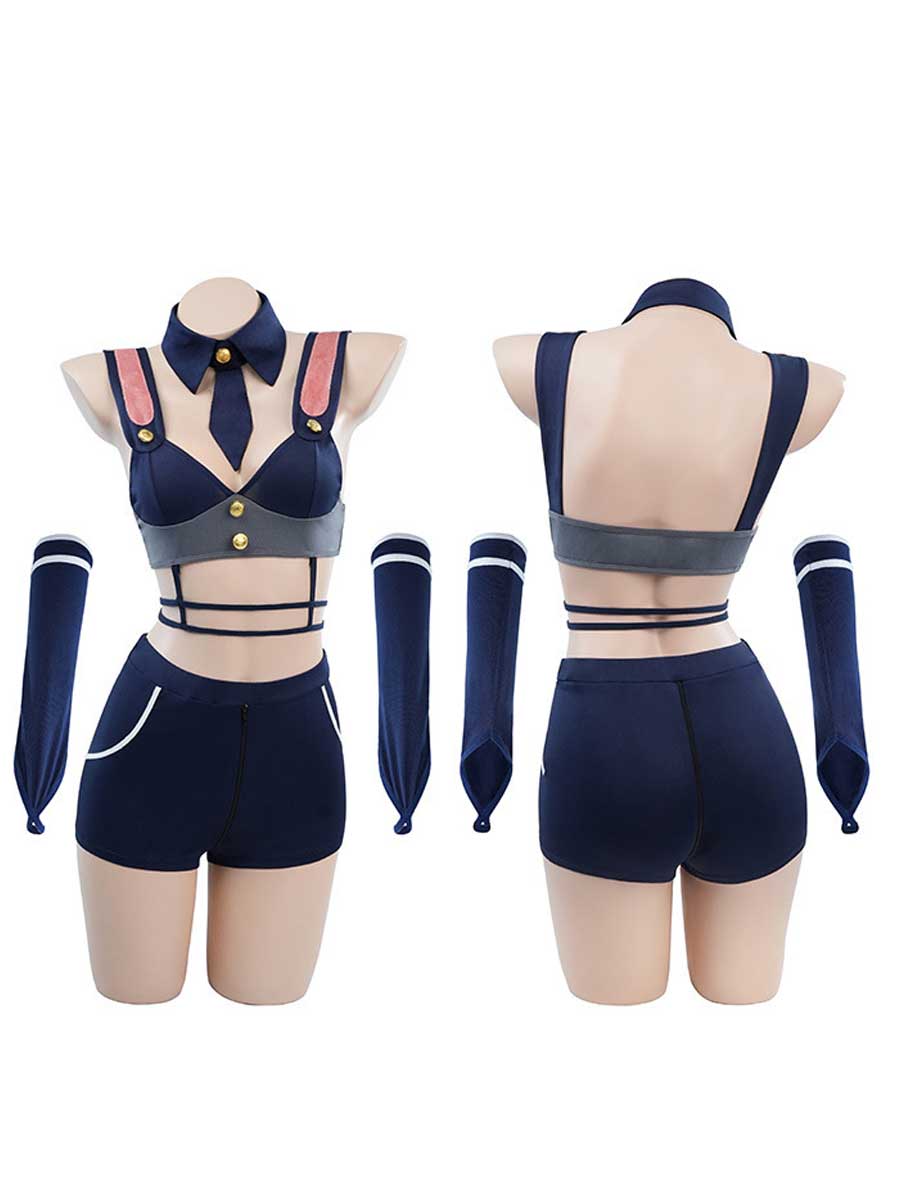 Design: This Sexy Bunny Cosplay Costume featuring a bra top with underbust strappy detailing, wide shoulder straps, a bunny ear headband, and a matching shorts, crotch zipper up closure, this costume creates an edgy yet playful look that will get all the attention.