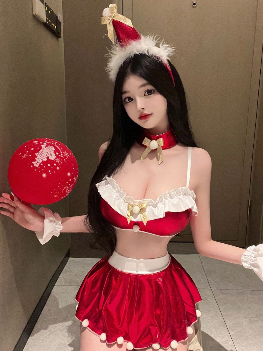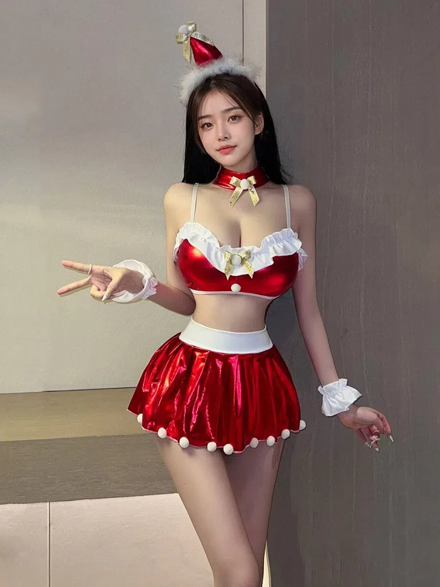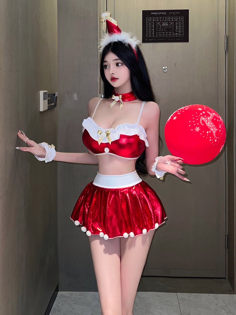Design: This Santa Claus Costume featuring a red metallic bra top with ruffled trim, adjustable spaghetti straps, golden bow accents, and a matching mini skirt with velcro closure, white furry pom pom hemline.