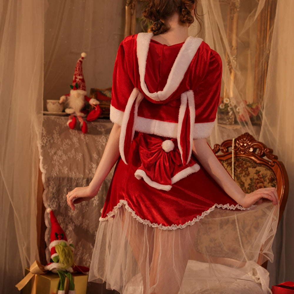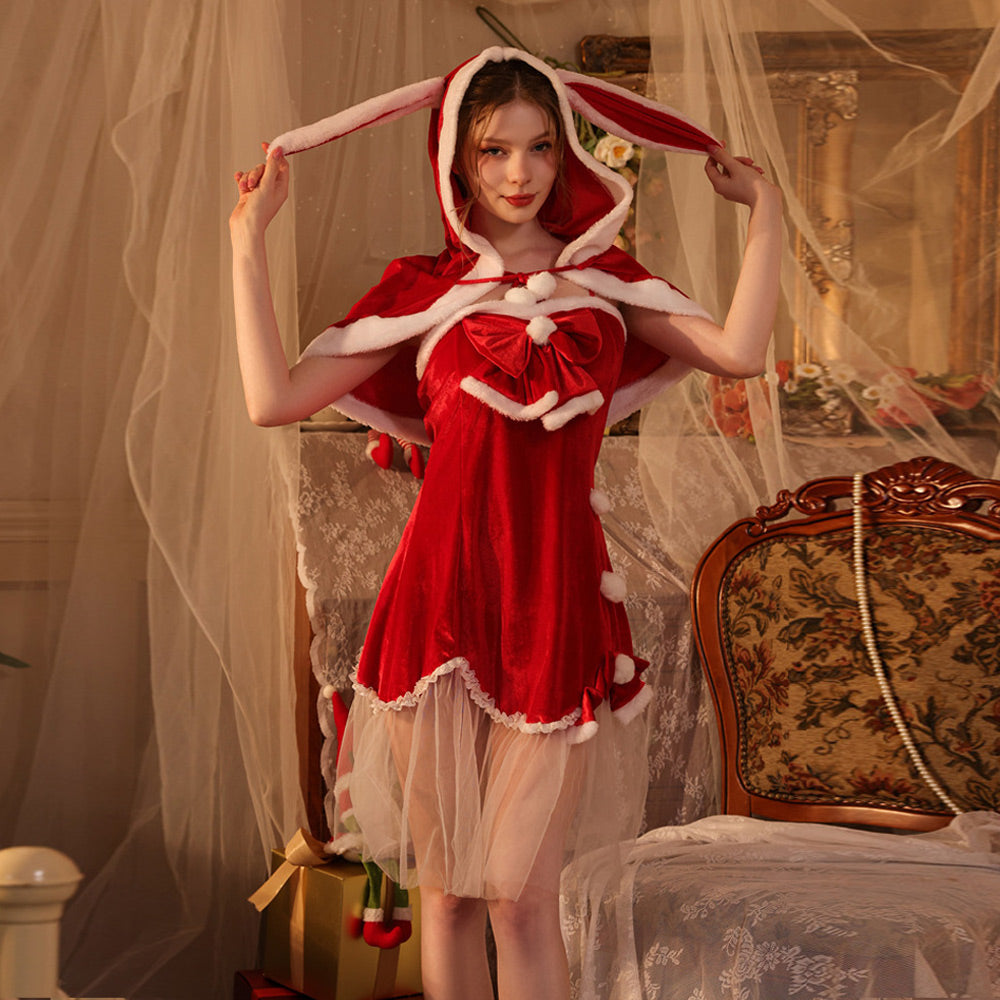 Design: This Naughty Elf Costume dress featuring a red dress with white fur trim, front bow accents, sheer mesh hemline, and a cropped red velvet cape with attached hood and bunny ears, this costume is sure to make you stand out from the crowd. The material is soft and comfortable, and the details make this costume look festive and stylish.