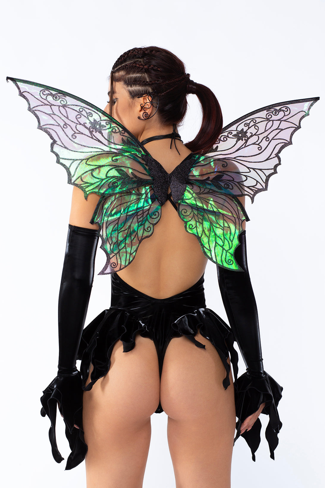 Featuring a bold front cutout, this piece is designed to enchant. Double crisscross straps frame your back, adding a striking, sculpted detail that enhances your silhouette. Playful ruffles adorn your hips, cascading down to a delicate lettuce hem finish for an enchanting touch of movement. Crafted from shiny Lycra, this bodysuit molds to your body, offering a flawless fit that exudes both elegance and edge. Add the matching sleeves to the mix for a uniform look.