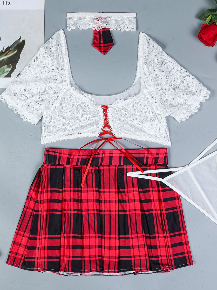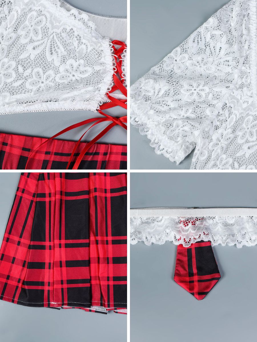 Design: This Naughty Scholastic Style lingerie set featuring a delicate white lace crop top with red ribbon lace-up front, and a matching red plaid pleated skirt, Embrace your playful side and add a touch of innocence to your bedroom.