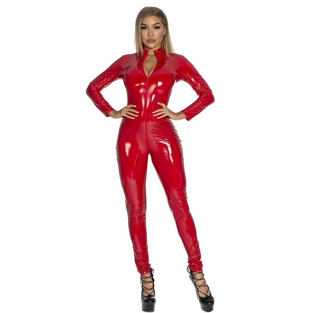 Plus Size Latex Catsuit One Piece Zipper Jumpsuit Long Sleeve Full Bodysuit for Women