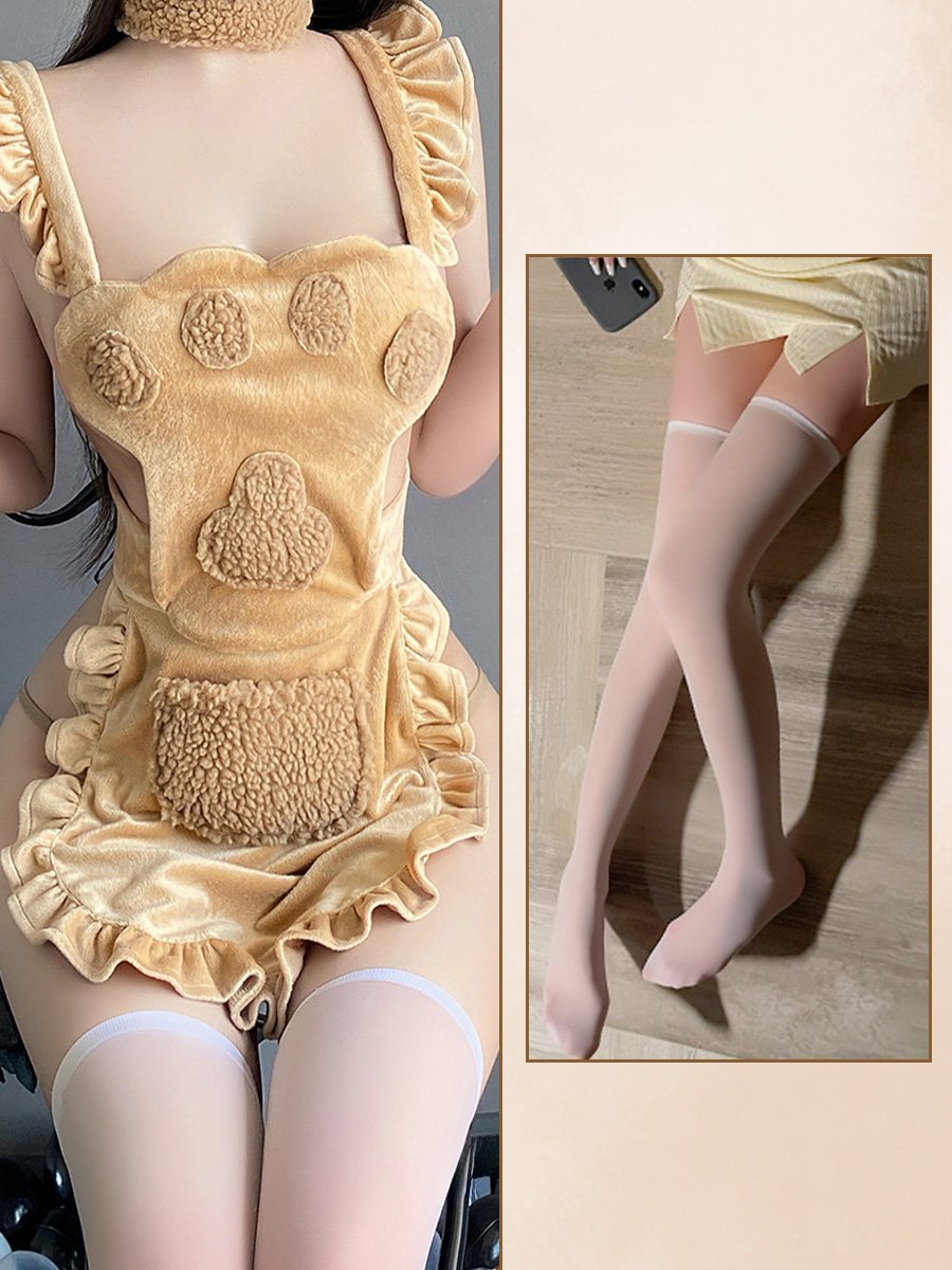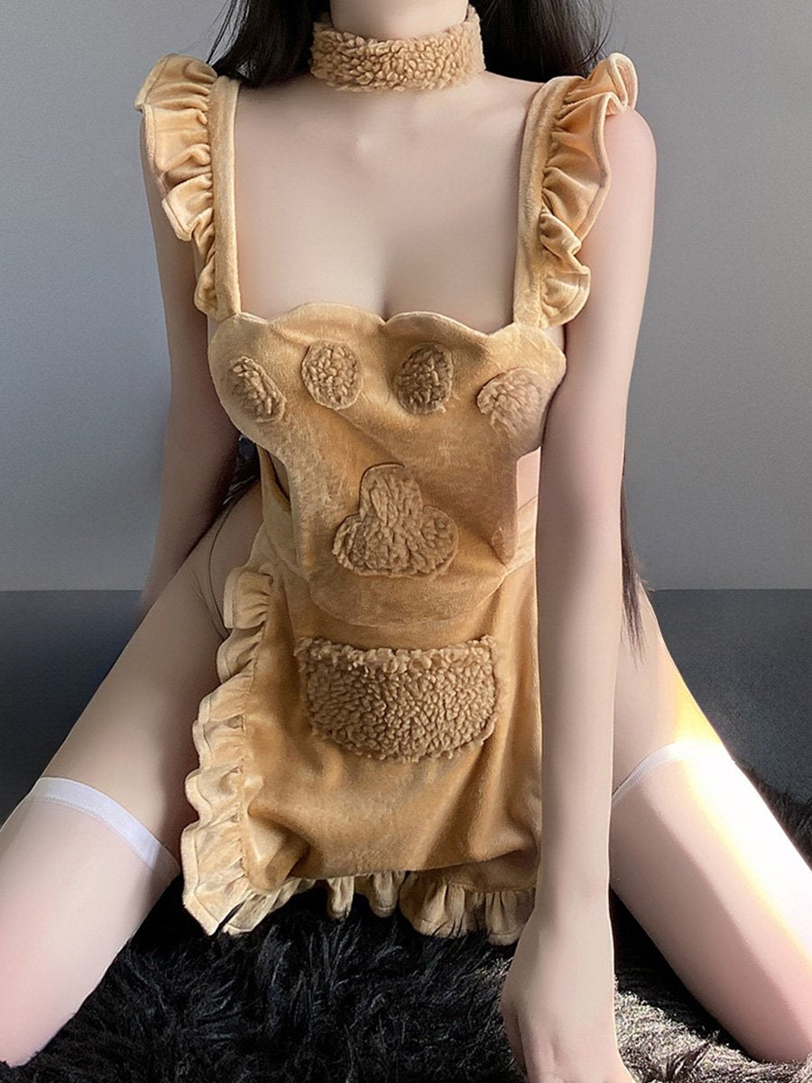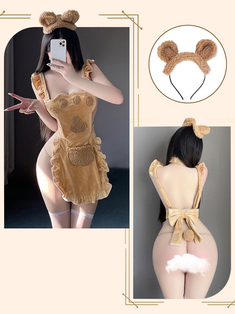 Design: Furry Teddy Bear Cosplay Lingerie Set featuring brown velvet maid dress with a paw patch, thick shoulder straps with ruffled trim, an attached apron, back velcro closure, big bow accents, and a matching furry bear ears headpiece. This playful and fun lingerie set is designed to enhance your curves and bring out your wild side.