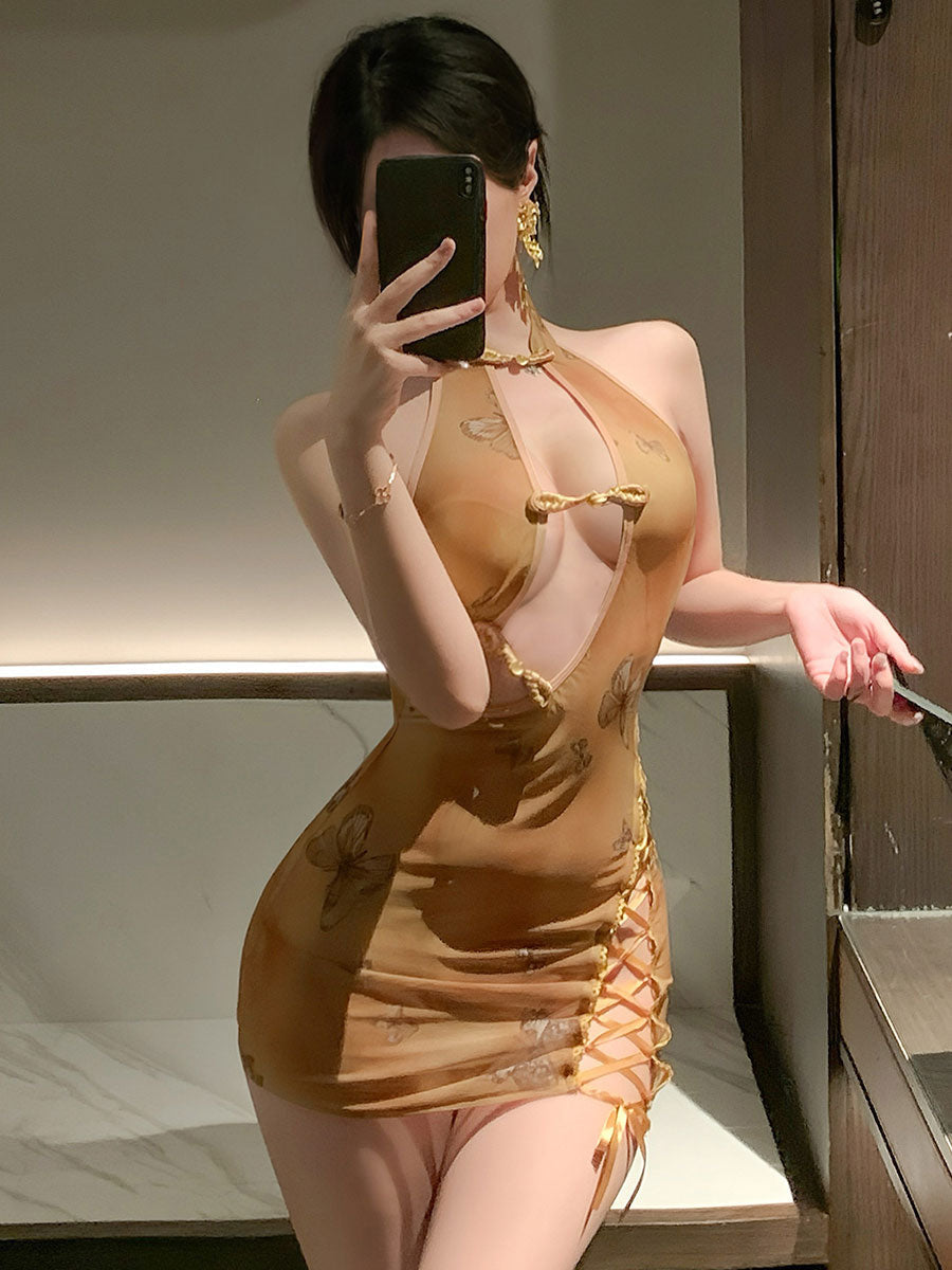 Design: Sexy Cheongsam Lingerie Dress is designed with traditional chinese collar, a flattering cutouts at the front and back, all-over delicate butterfly pattern, and sides lace-up closure. It makes you more attractive, charming, fashion and chic.