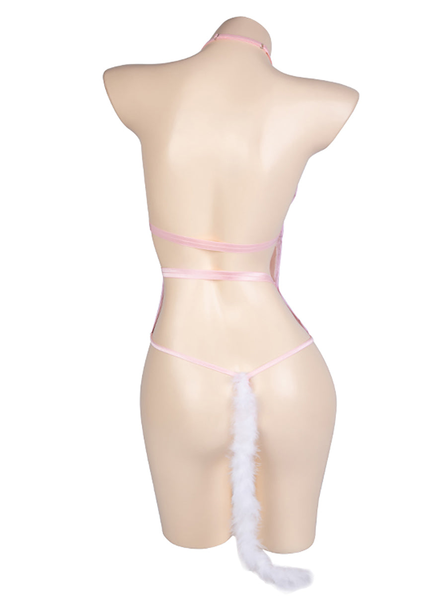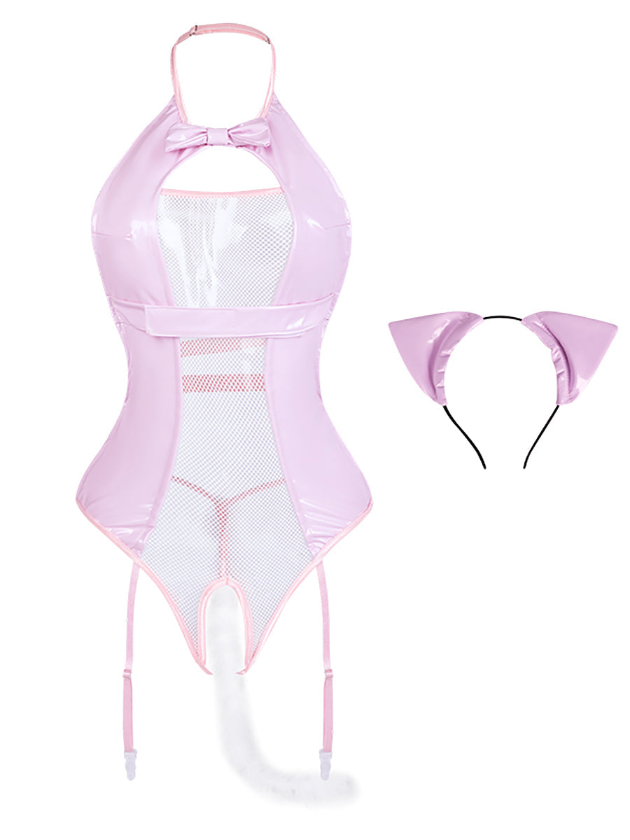 Design: Yomorio Open crotch teddy lingerie features pink wet look bodysuit with fishnet panels, halter neckline with pink bow accents, an open crotch, adjustable garter straps, and a high cut leg, this costume creates an edgy yet playful look that will get all the attention.
