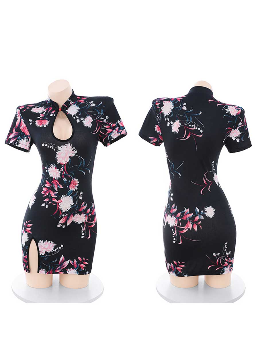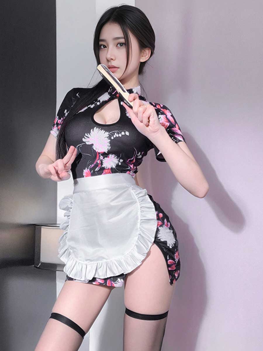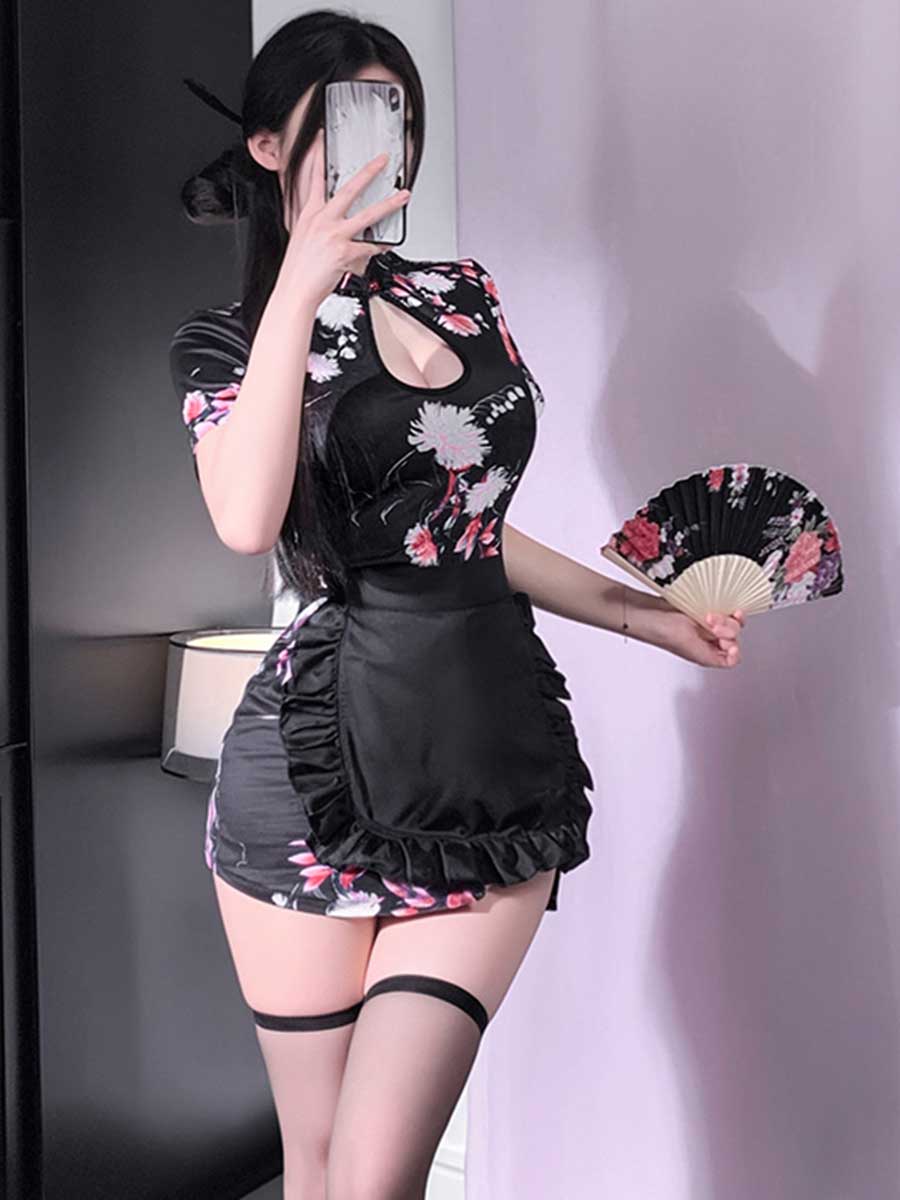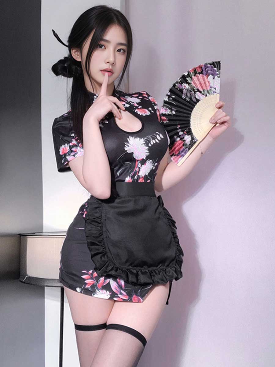 Design: Sexy Cheongsam Costume is designed with black short cheongsam dress, an allover floral print, mandarin neckline with a keyhole, side slit hemline, and a matching maid apron, ruffled trim, this two-piece lingerie set is perfect for a romantic night in.