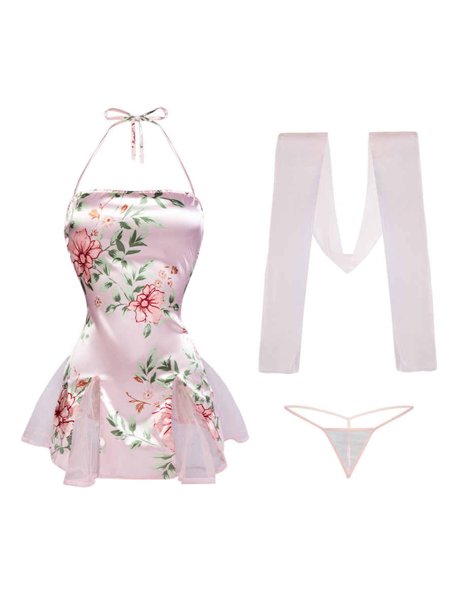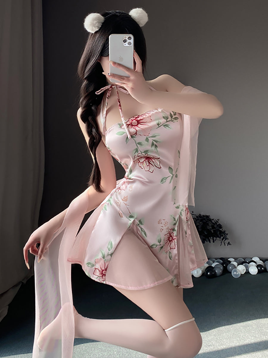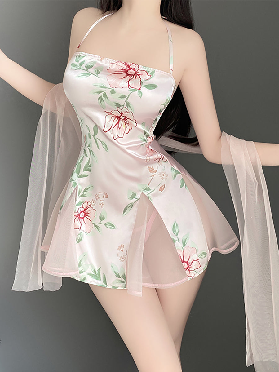 Design: Sexy Chinese Cheongsam Lingerie is designed with slik mini dress, halter straps, floral print, a lace-up back detail. No restraints on chest with narrow bralette design, and the mini dress are definitely fit on your body curves outline. It makes you more attractive, charming, fashion and chic.