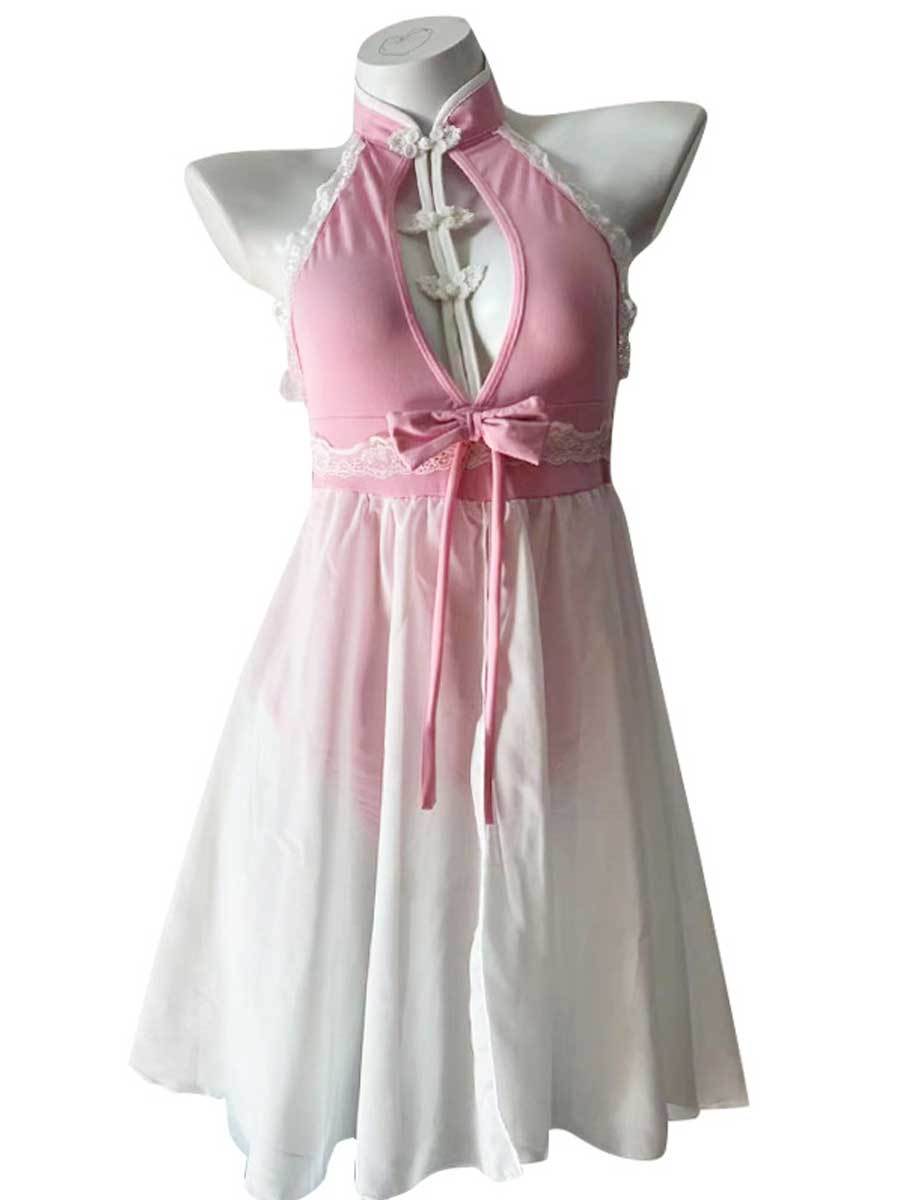 Design: Sexy Chinese Style Teddy Lingerie is featuring a traditional chinese buckle collar, front bow accents, a low open back, an attached white mesh train, and an open crotch.