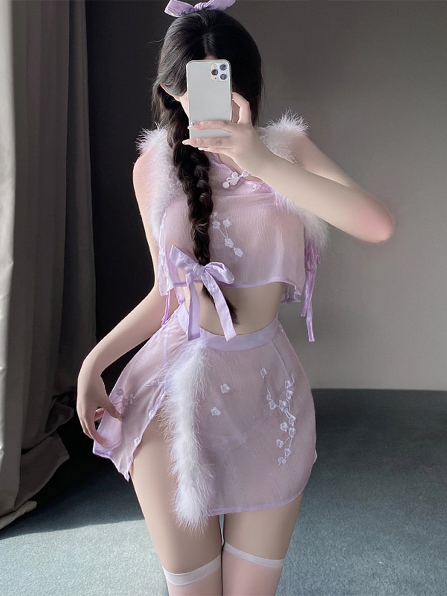Design: The unique design of the seductive cheongsam sleeveless top a marabou trim, traditional chinese collar, allover floral embroidery, retro buckle closure, and a matching mini skirt with a high slit hemline.