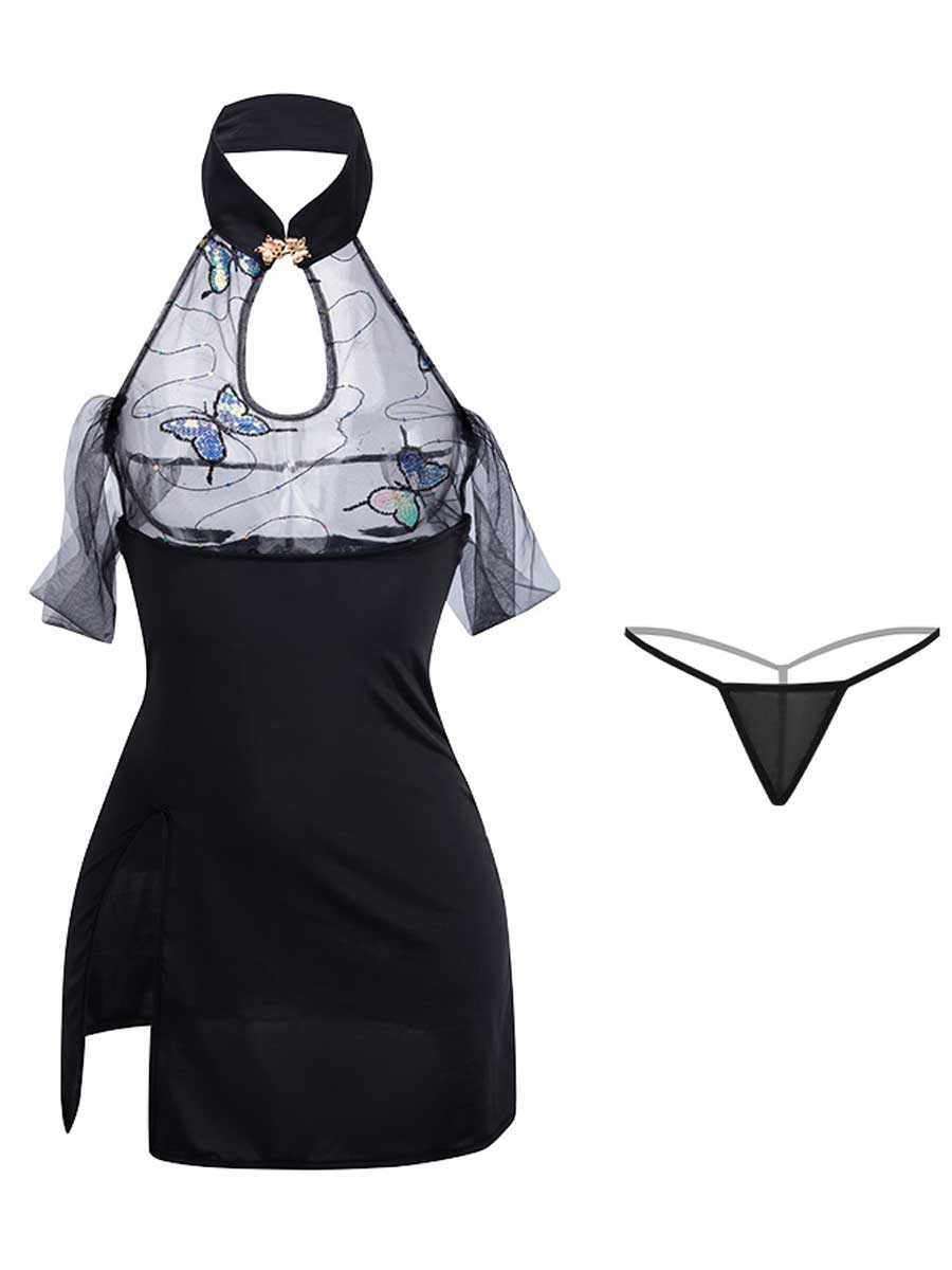 Design: Sexy Chinese Cheongsam Lingerie is designed with black mini dress, sheer mesh cups with sequins butterfly, traditional chinese collar with a keyhole, sheer mesh off shoulder sleeves, and high slit hemline. No restraints on chest with narrow bralette design, and the mini dress are definitely fit on your body curves outline. It makes you more attractive, charming, fashion and chic.