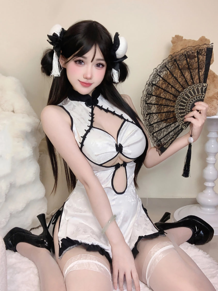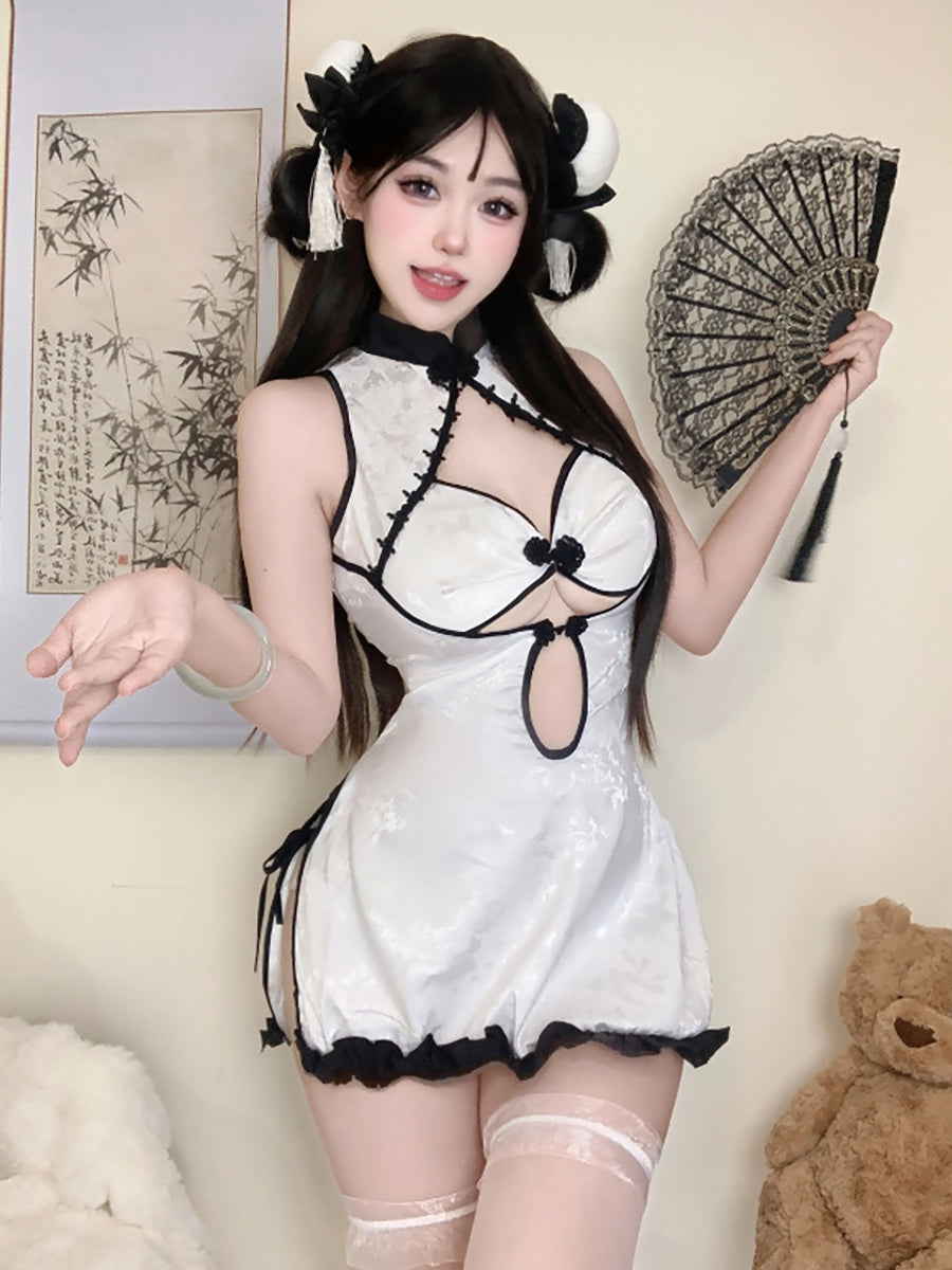 Design: Sexy Chinese Cheongsam Lingerie is designed with white and black dress, traditional chinese buckle neckline with a keyhole, and a mini-length skirt with a high side slit. No restraints on chest with narrow bralette design, and the mini dress are definitely fit on your body curves outline. It makes you more attractive, charming, fashion and chic.