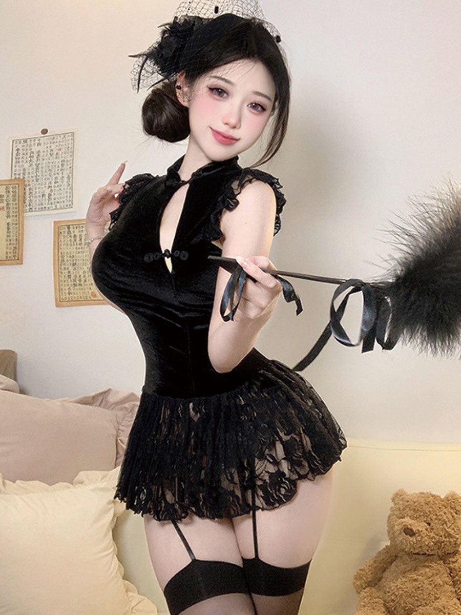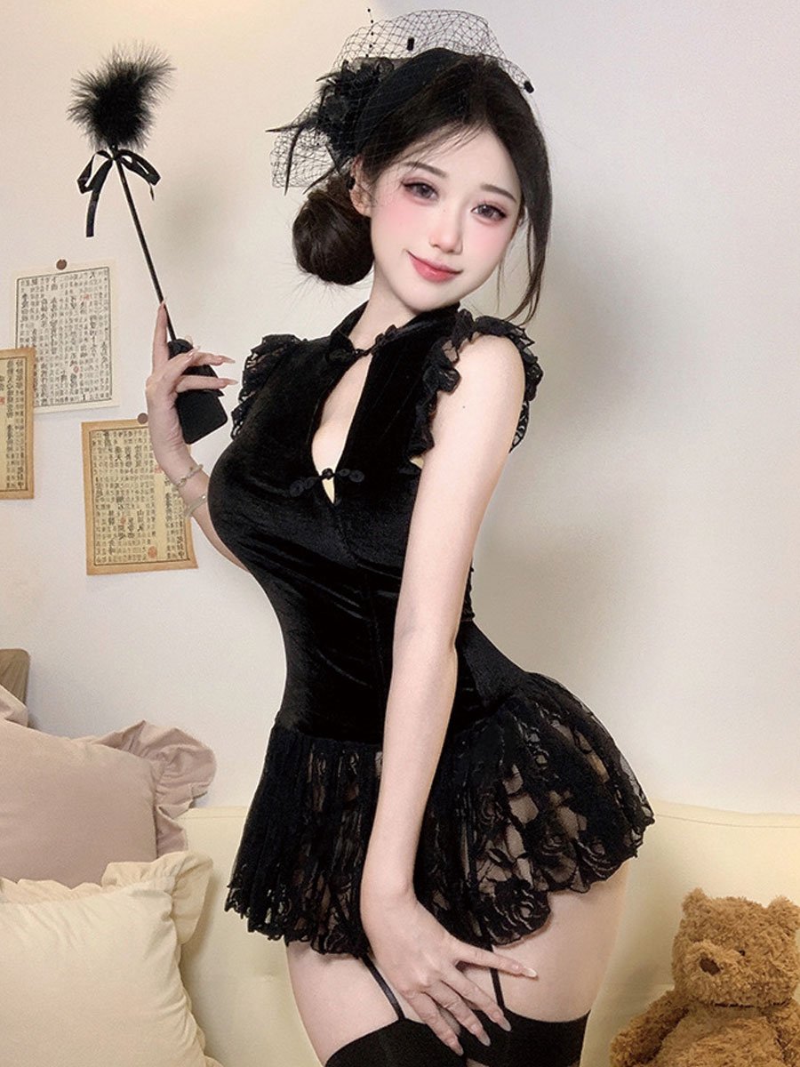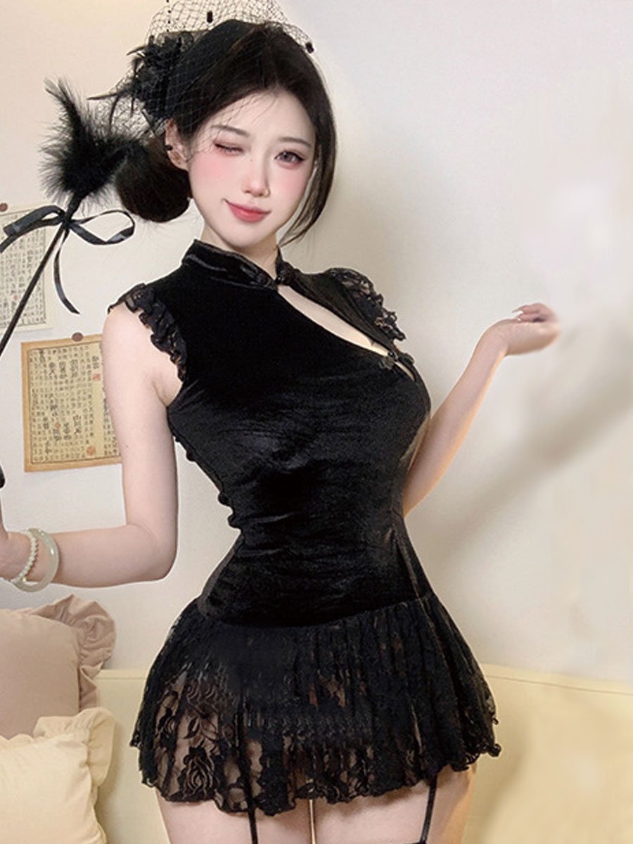 Design: Yomorio Chinese Style Lingerie Dress featurings mock neckline, traditional chinese buckle closure, sheer floral lace hemline, the length of the cheongsam can't completely cover the buttocks, which is extremely sexy.
