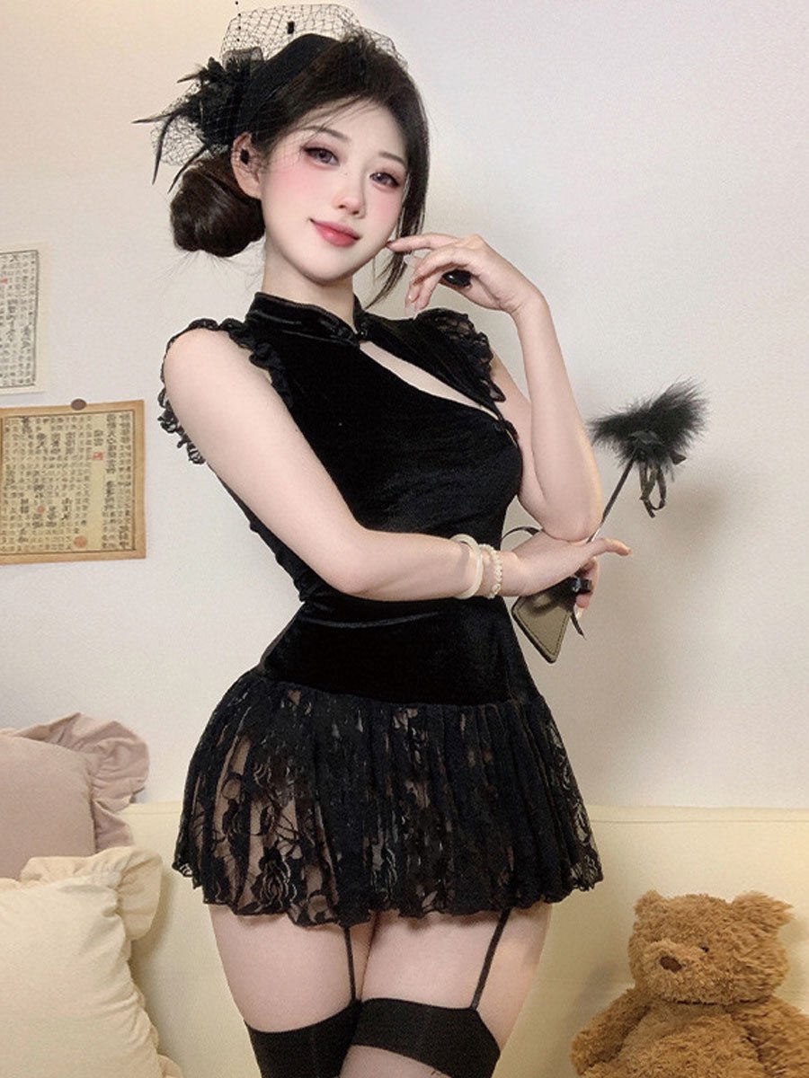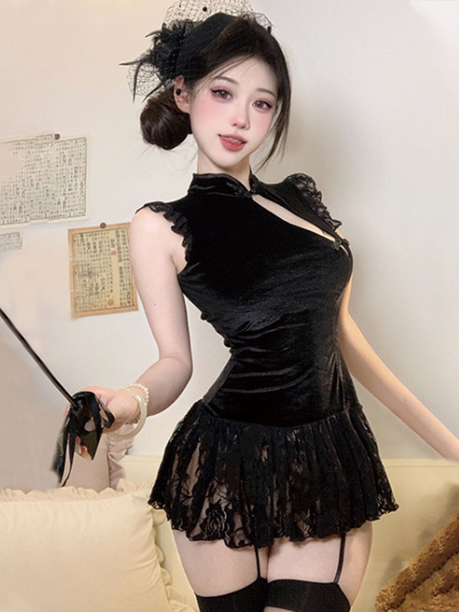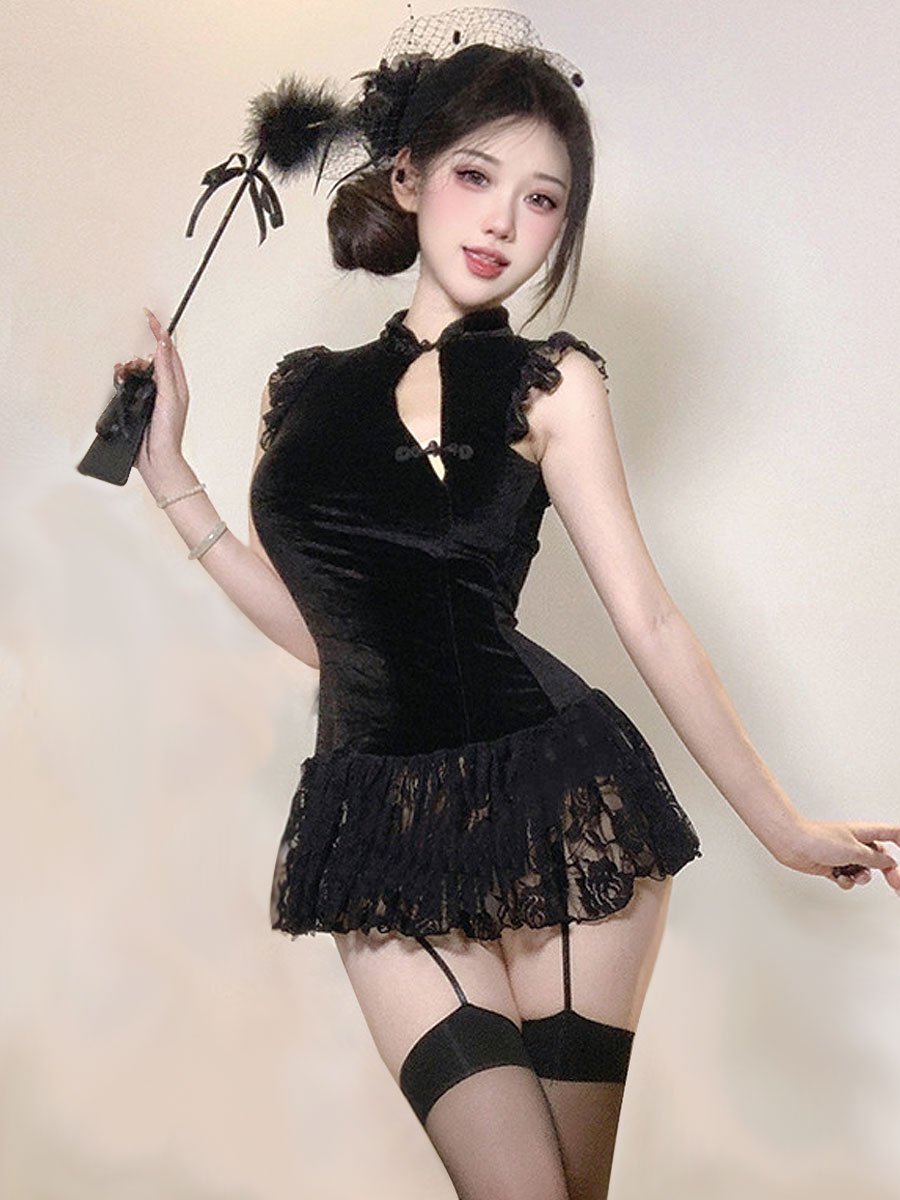 Design: Yomorio Chinese Style Lingerie Dress featurings mock neckline, traditional chinese buckle closure, sheer floral lace hemline, the length of the cheongsam can't completely cover the buttocks, which is extremely sexy.