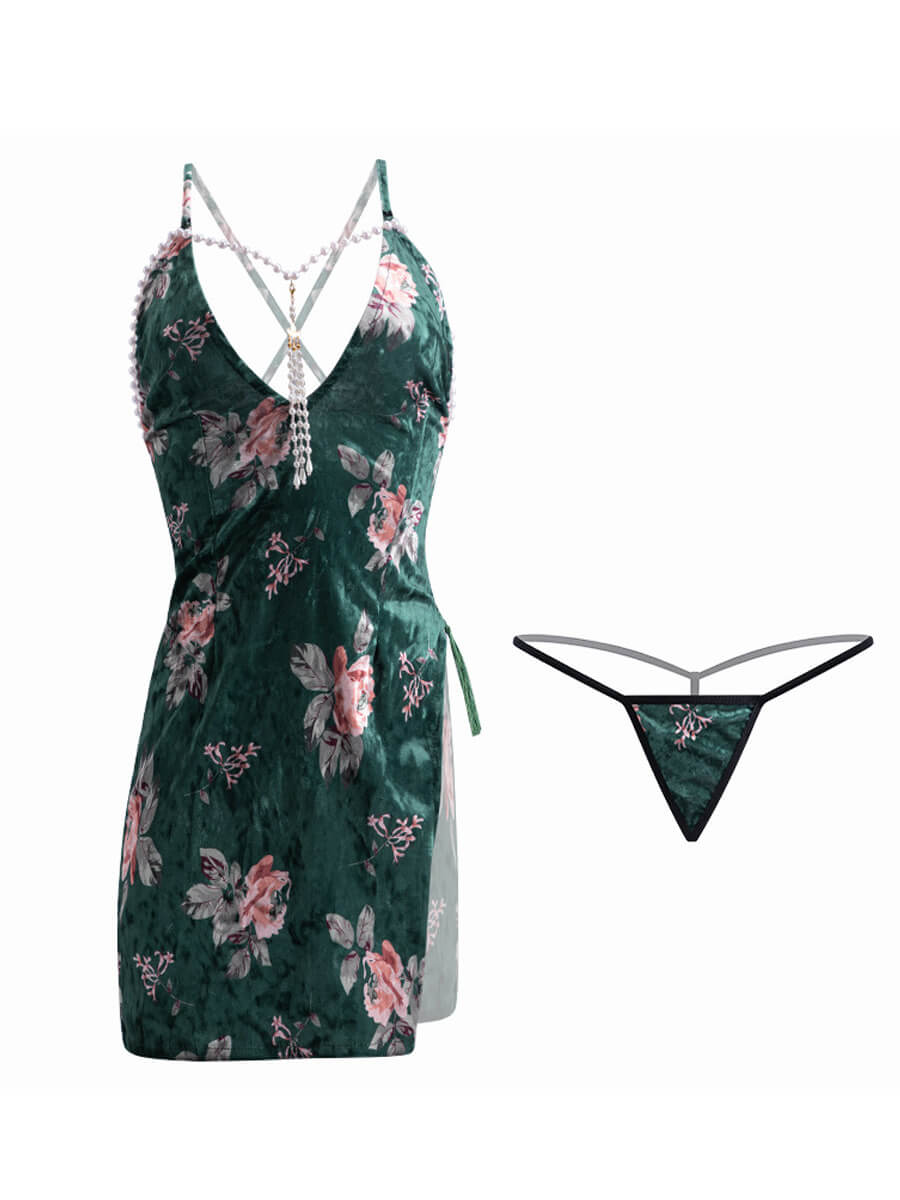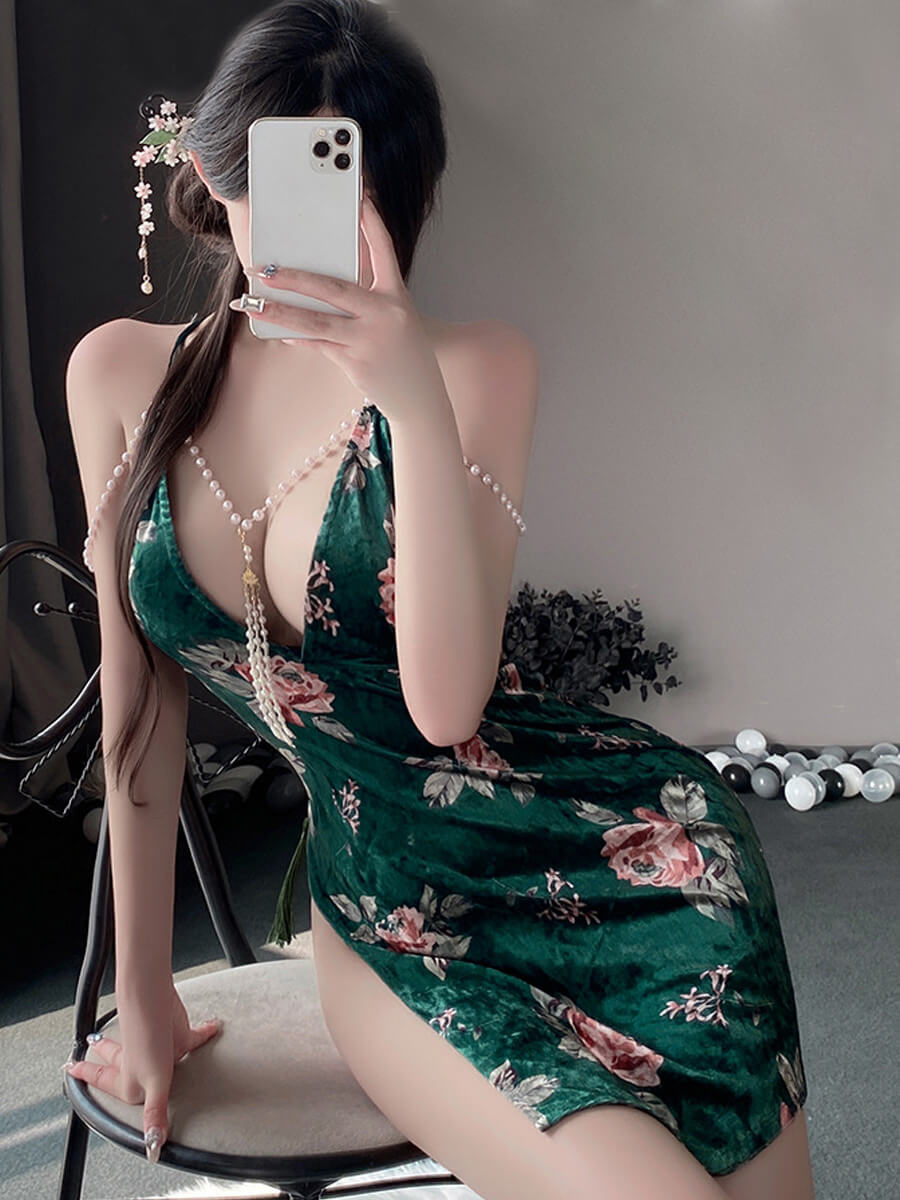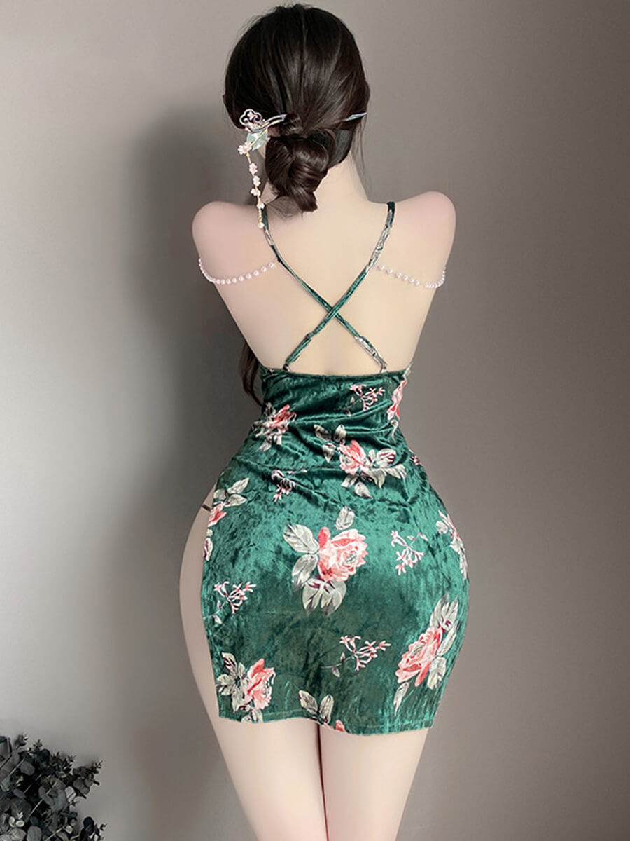 Design: Sexy Chinese Cheongsam Lingerie is designed with velvet mini dress, adjustable spaghetti straps and back criss-cross design, pearl chain accents, traditional chinese collar with a keyhole, an allover floral printed, and high slit hemline. No restraints on chest with narrow bralette design, and the mini dress are definitely fit on your body curves outline. It makes you more attractive, charming, fashion and chic.