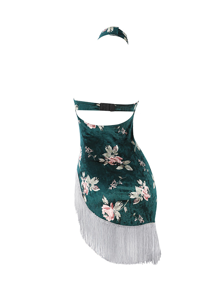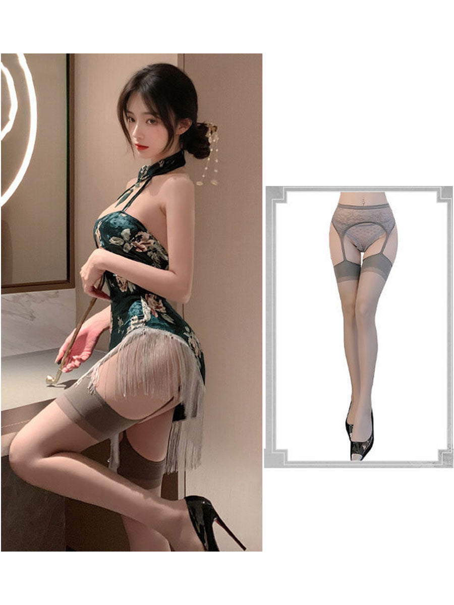 Design: Sexy Vintage Cheongsam Lingerie is designed with velvet mini dress, traditional chinese collar with a keyhole, an allover floral printed, and an asymmetrical tassel hem. No restraints on chest with narrow bralette design, and the mini dress are definitely fit on your body curves outline. It makes you more attractive, charming, fashion and chic.