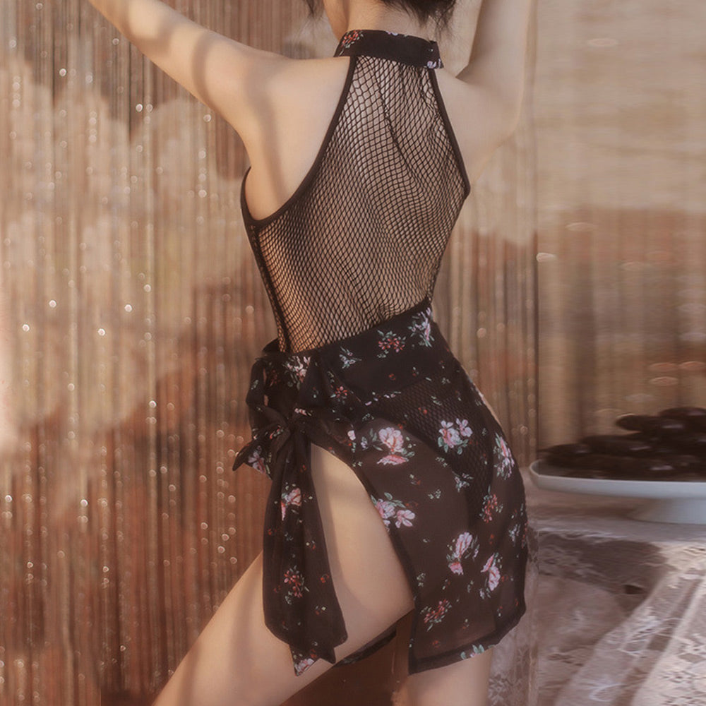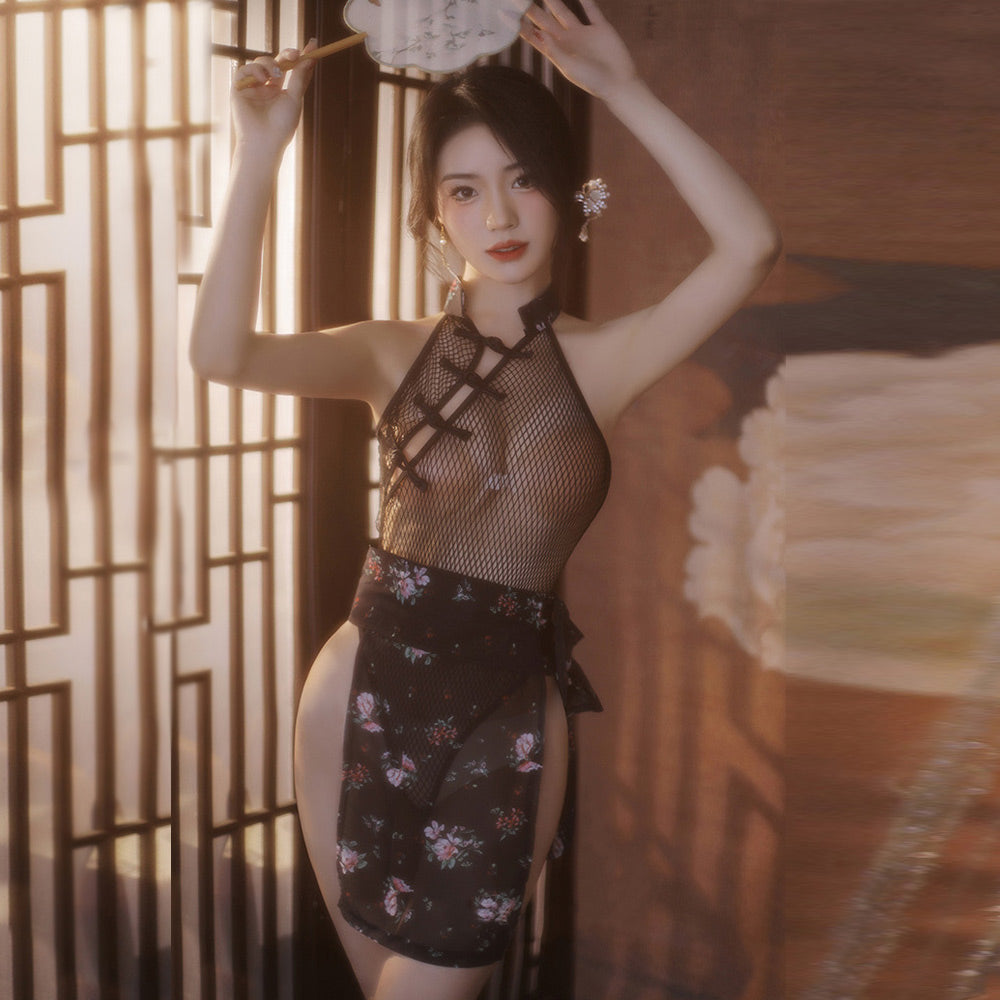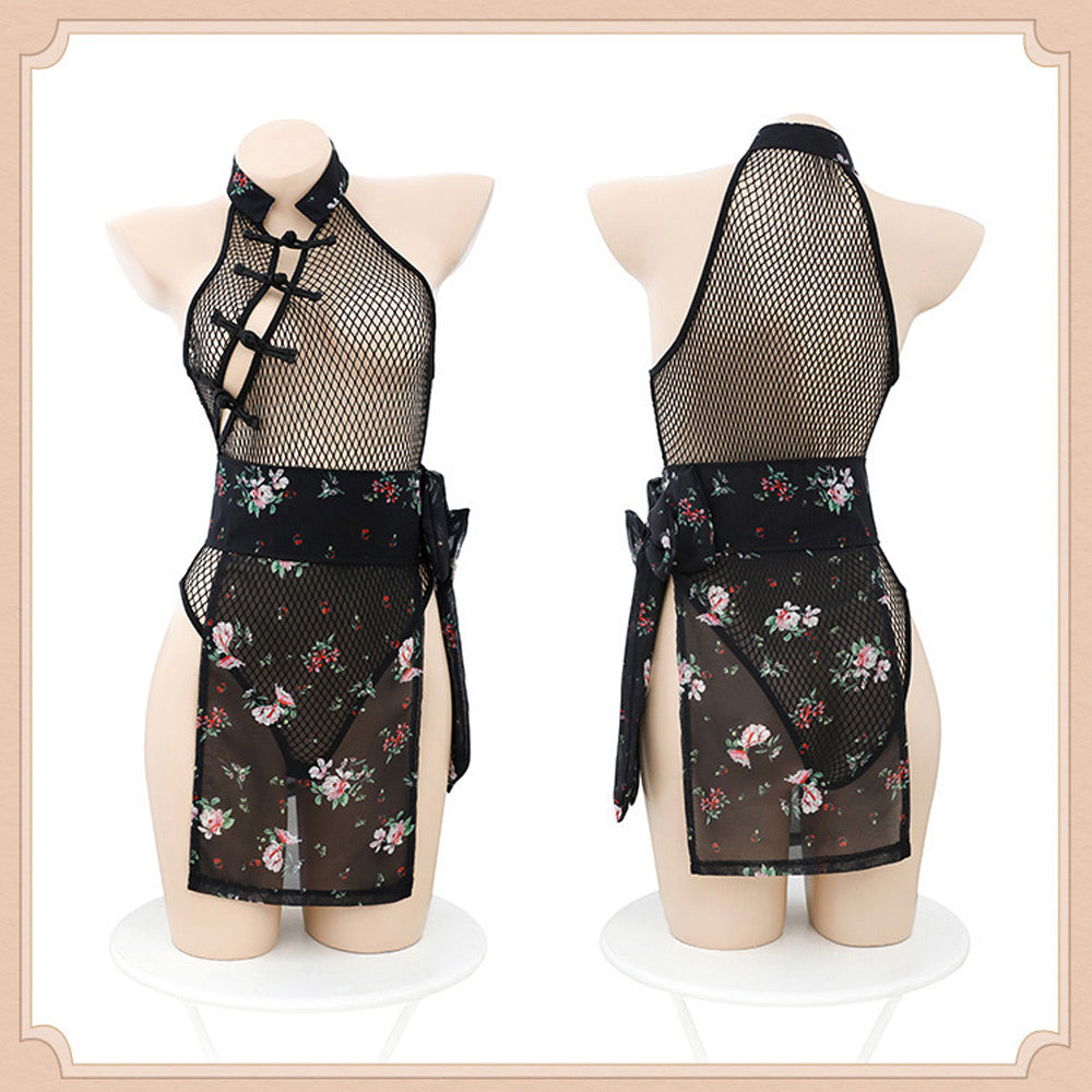 Design: Sexy Transparent Cheongsam Lingerie is designed with black fishnet bodysuit