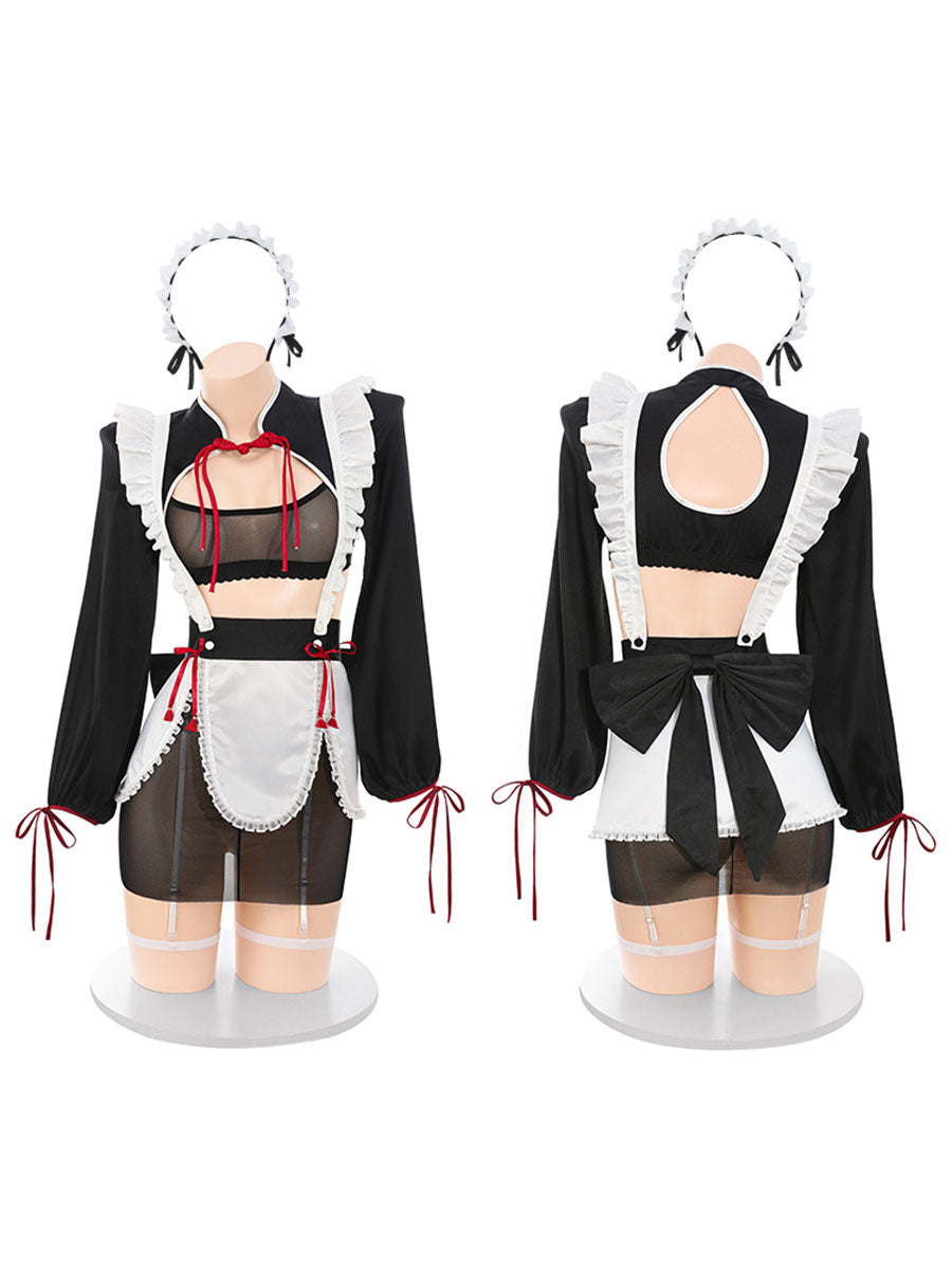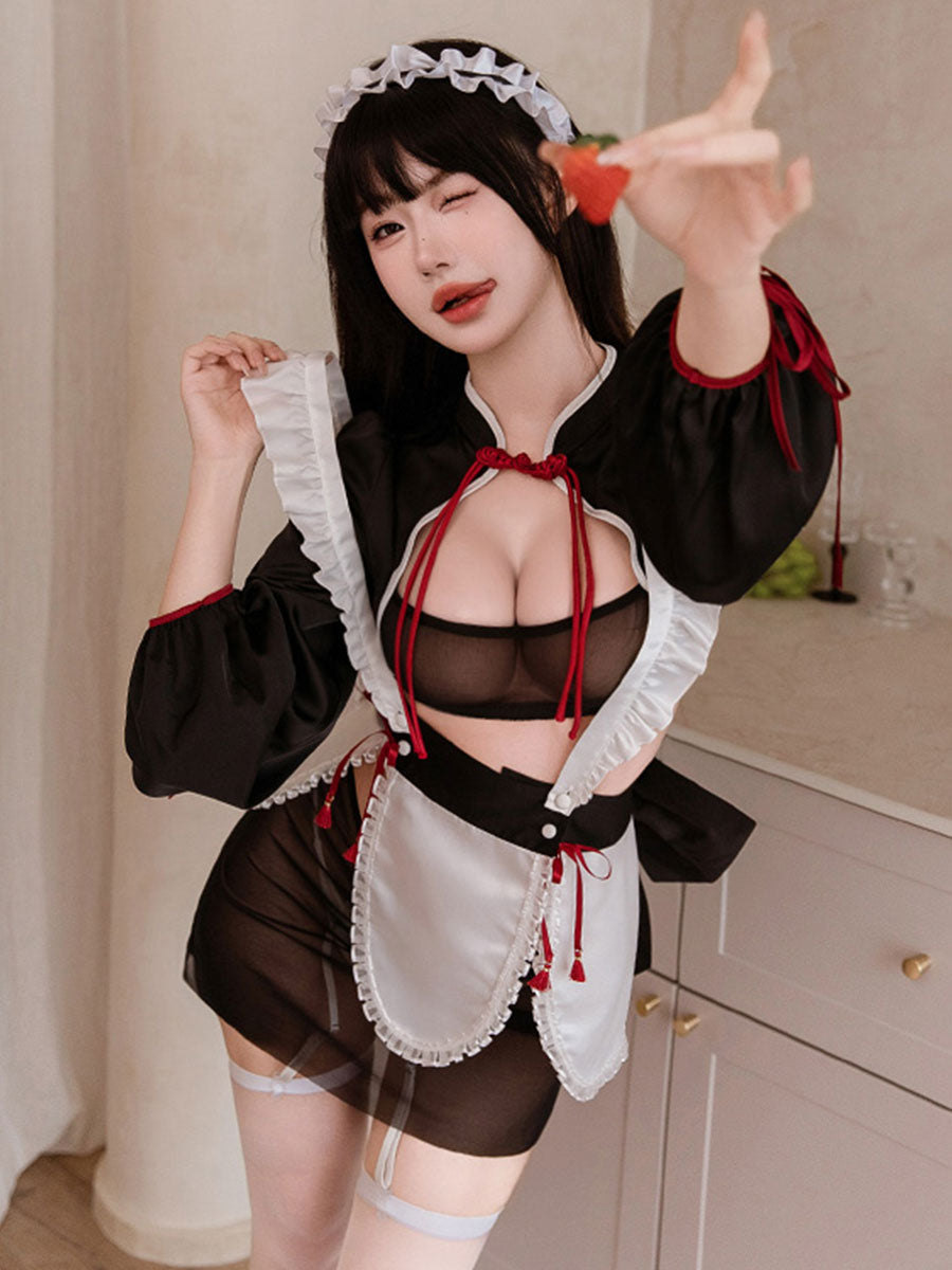 Design: Yomorio Sexy Maid Outfit featuring a sheer black mesh base, white ruffle apron, and open-back crop top, it’s trimmed with red ribbon accents and finished with a large statement bow on the back. Long sleeves add a touch of elegance, while the see-through skirt and garter straps bring bold energy to your roleplay fantasies.
