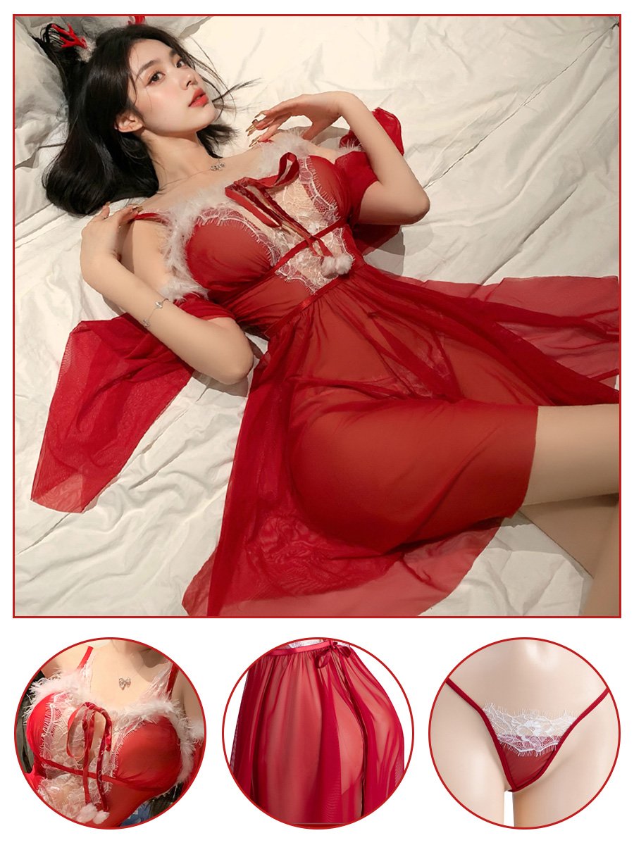 Design: This Sexy Red Christmas Lingerie features a red mini dress with faux fur trimming, adjustable spaghetti straps, a sheer mesh bodice wtih a vented open front, it thoroughly shows off your stunning curves. Back lace up design offer flexibility enough tightness for any body-shaped women would need.
