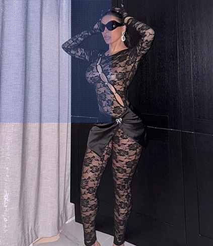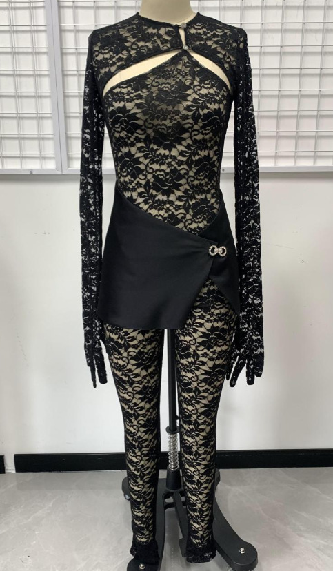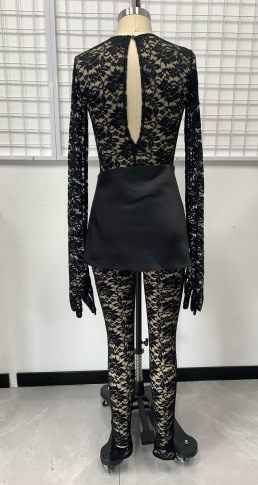Sexy Cutout See-through Round Neck Long Sleeve Lace Tight Apron One-piece Suit