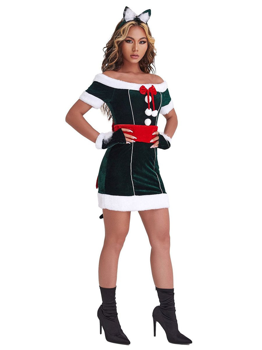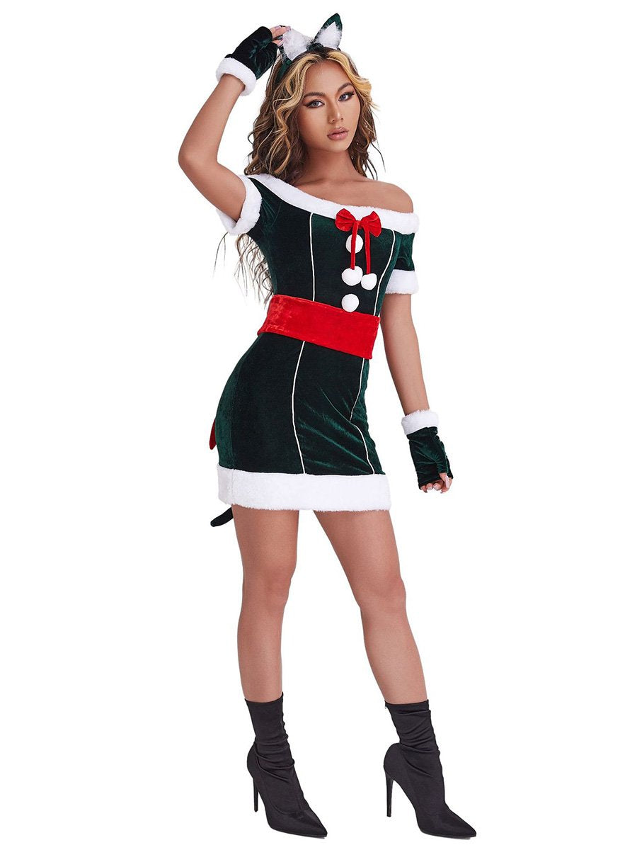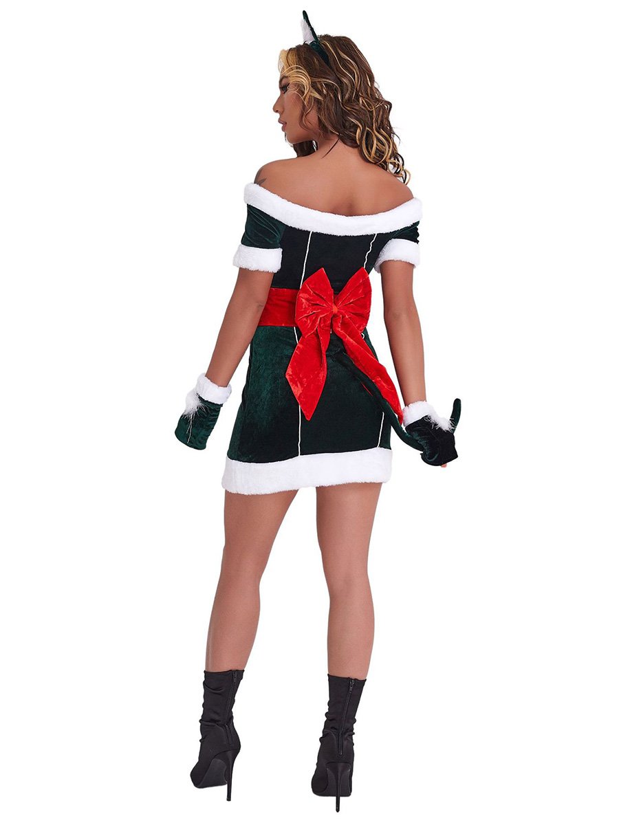 Design: This Naughty Elf Costume dress featuring a mini dress, off shoulder sleeves, white faux fur trimming, red wide belt with bow accents, and a matching gloves, this costume is sure to make you stand out from the crowd. The material is soft and comfortable, and the details make this costume look festive and stylish.