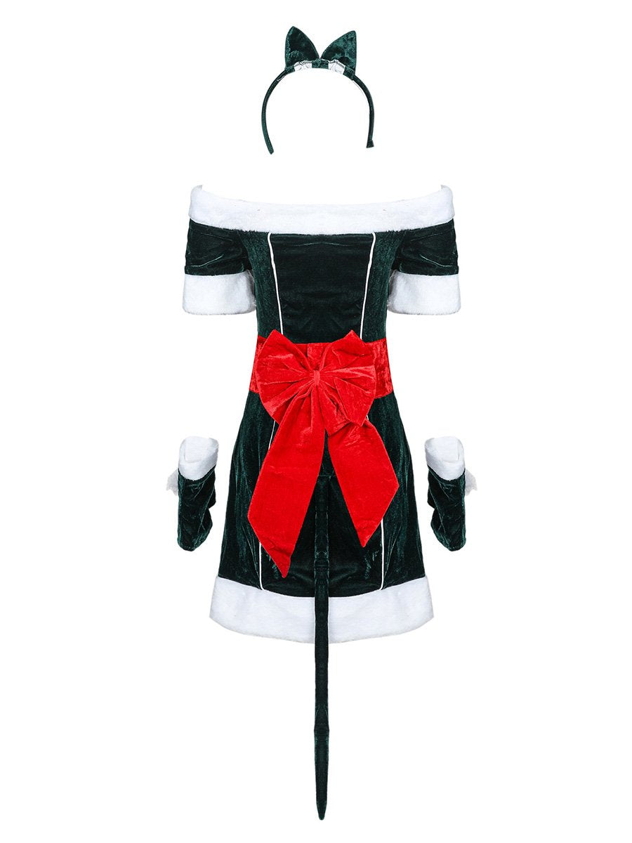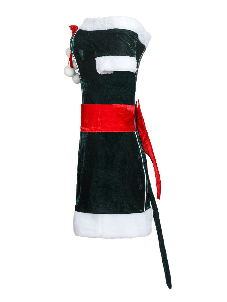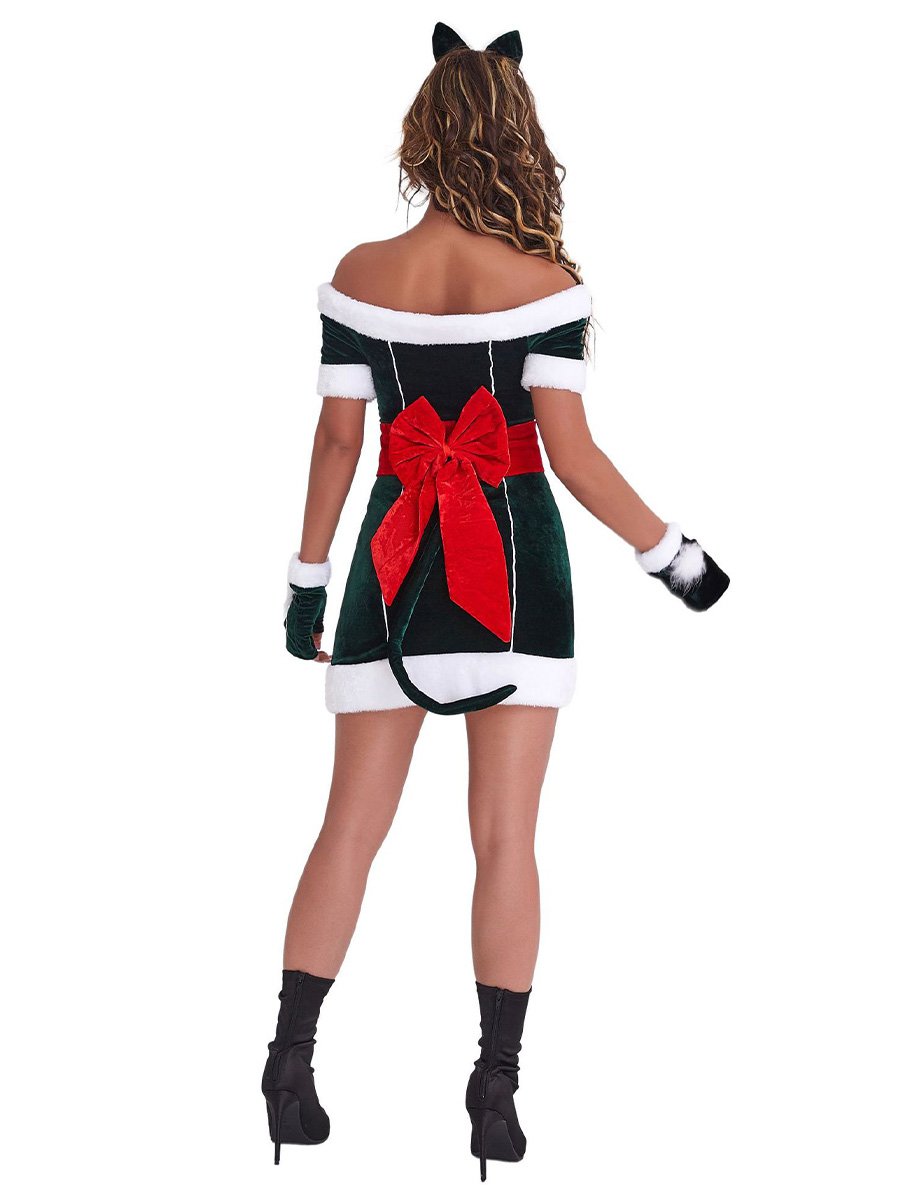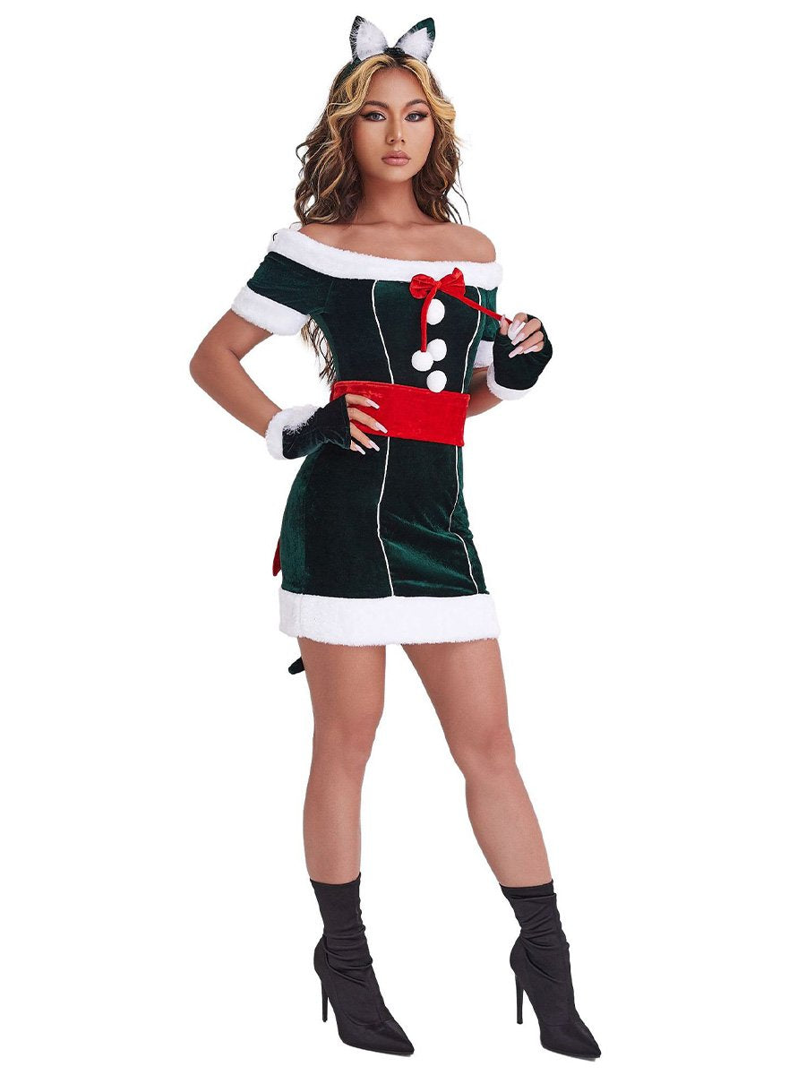 Design: This Naughty Elf Costume dress featuring a mini dress, off shoulder sleeves, white faux fur trimming, red wide belt with bow accents, and a matching gloves, this costume is sure to make you stand out from the crowd. The material is soft and comfortable, and the details make this costume look festive and stylish.