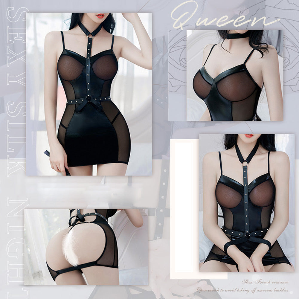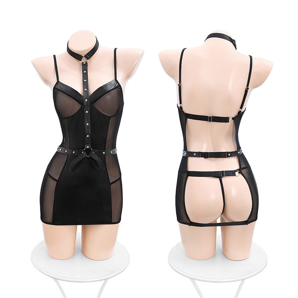 Sexy Exotic Lingerie Set Wet Look Bodycon Dress with Harness Sheer Mesh Backless Lingerie Dress