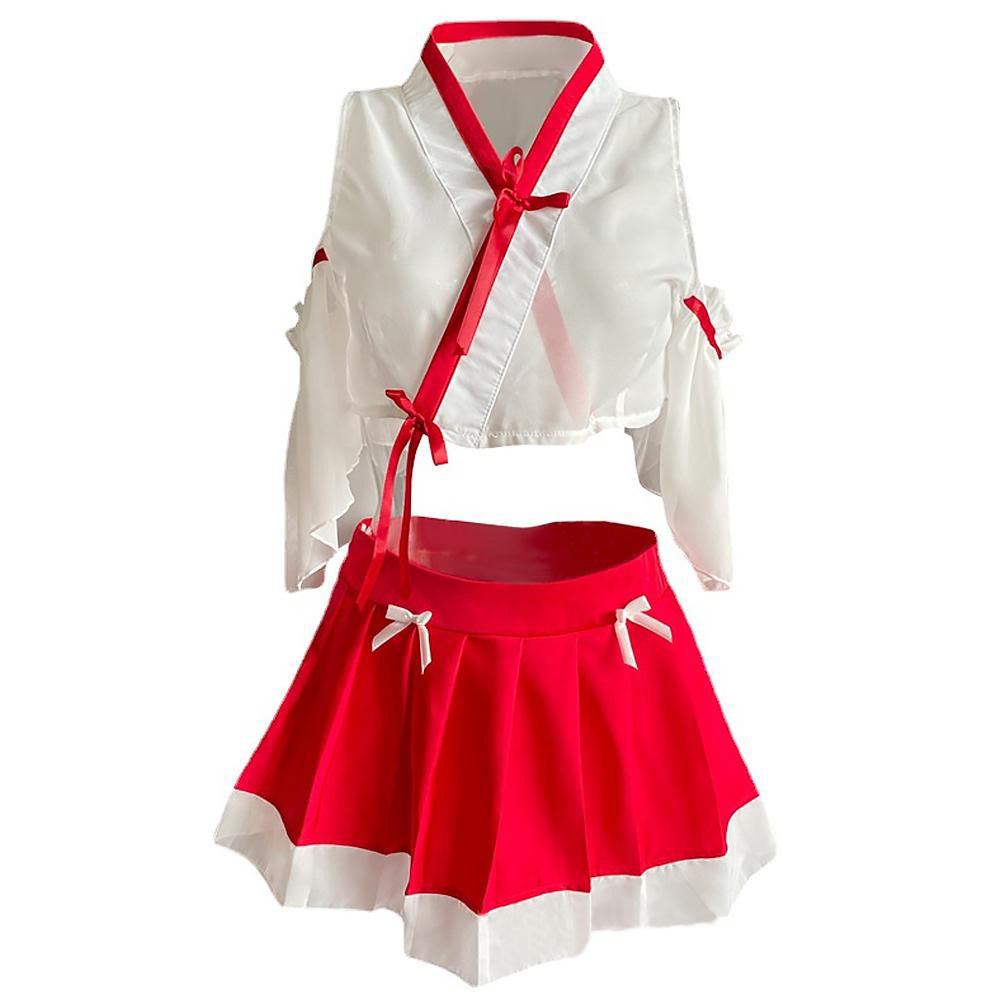 Design: The pleated skirt and white Kimono has been traditional for the Shrine Maiden. White kimono top with the red detailing features cold shoulder, half flared sleeve, all-over sheer lace is tantalizing to your partner. Mini skirt featuring cute bowknot and white hemline, will make you sexy, cute and attractive;