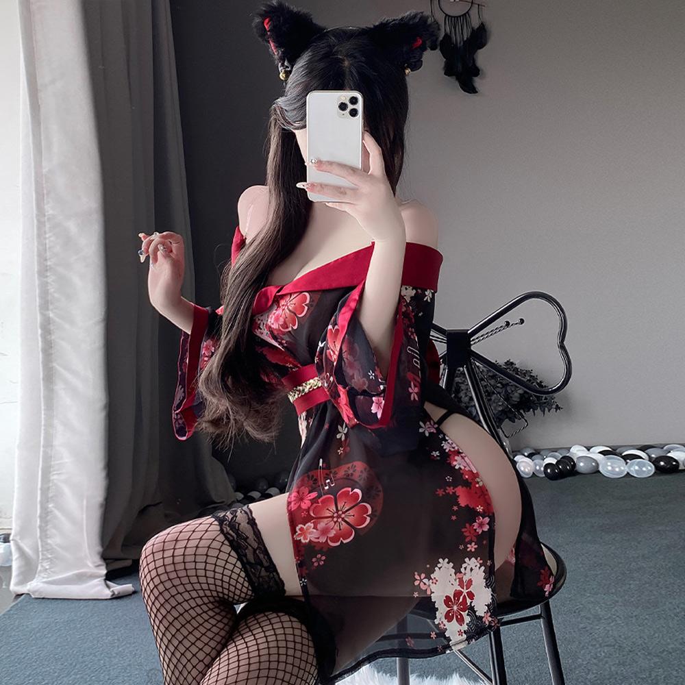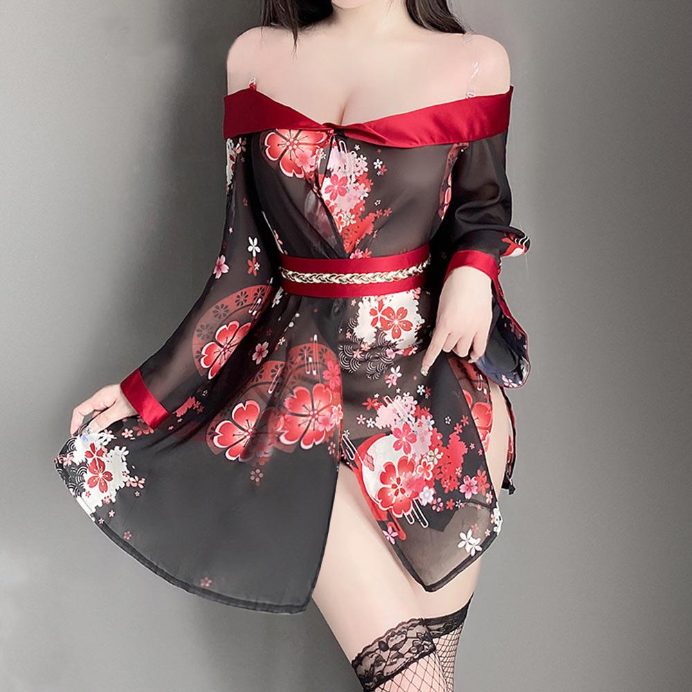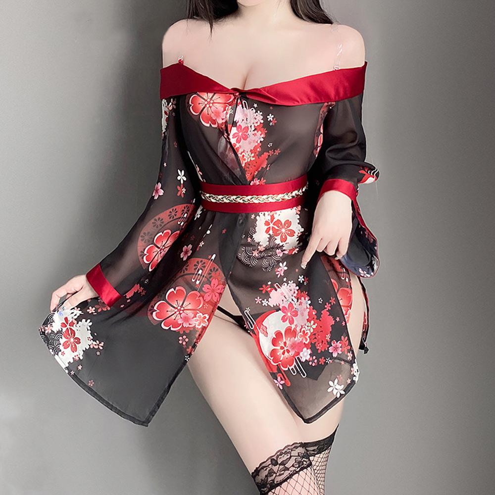 Sexy Kimono Lingerie Anime Japanese Geisha Costume Sheer Floral Cosplay Lingerie Dress