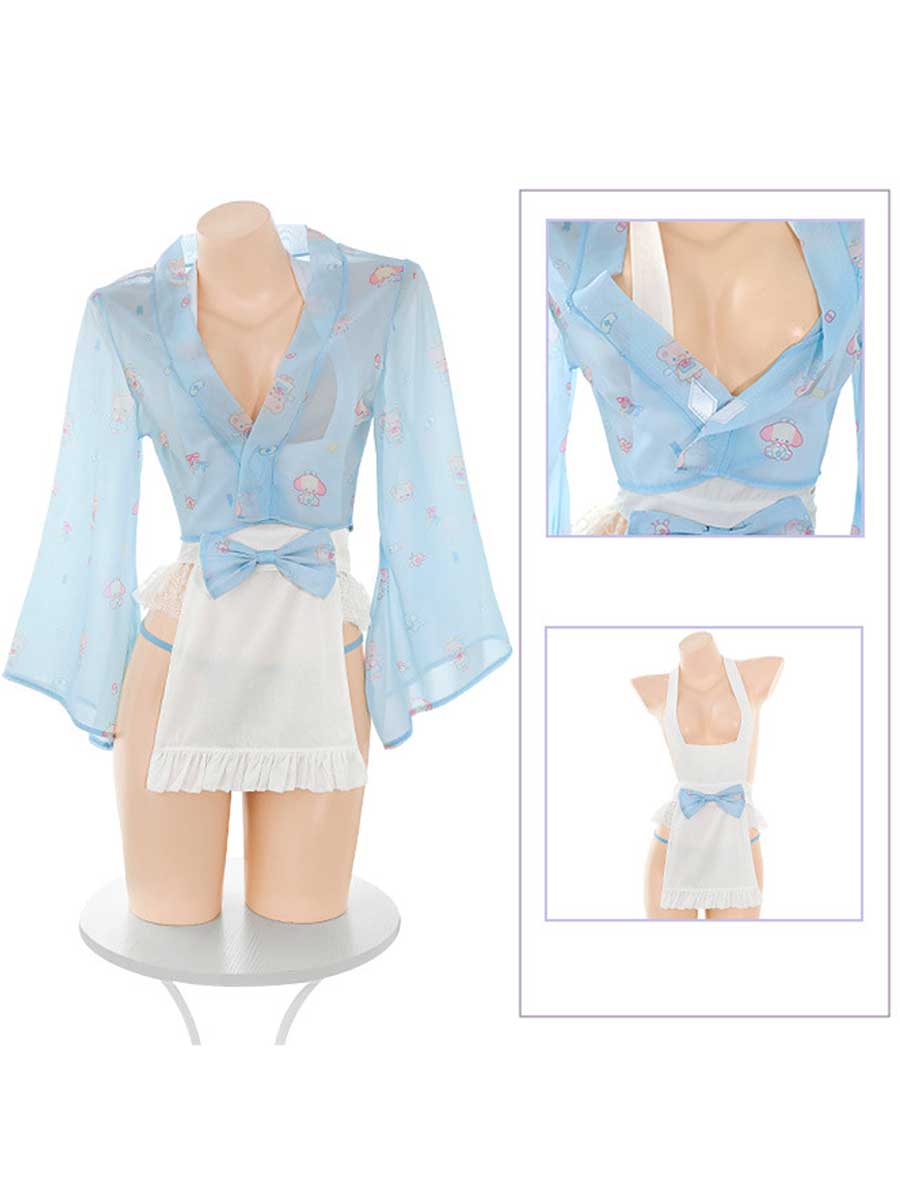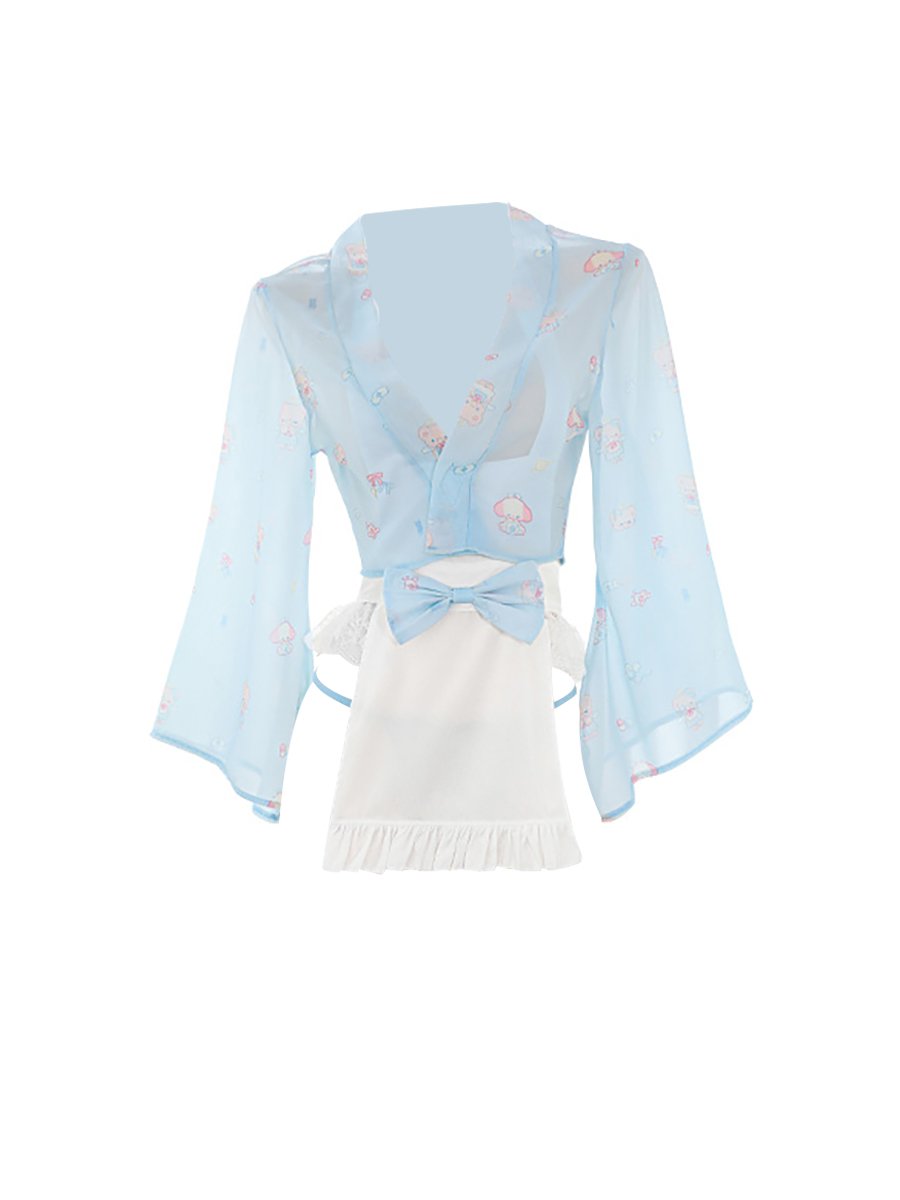 Design: Sexy kimono cosplay outfit featuring sheer chiffon kimono robe, wide long sleeves, show off your curves and figure while staying comfortable, and a matching white apron with back ties closure. This cute cartoon animal print on this women's kimono pajamas adds interest to your life and makes you look younger and sexier.