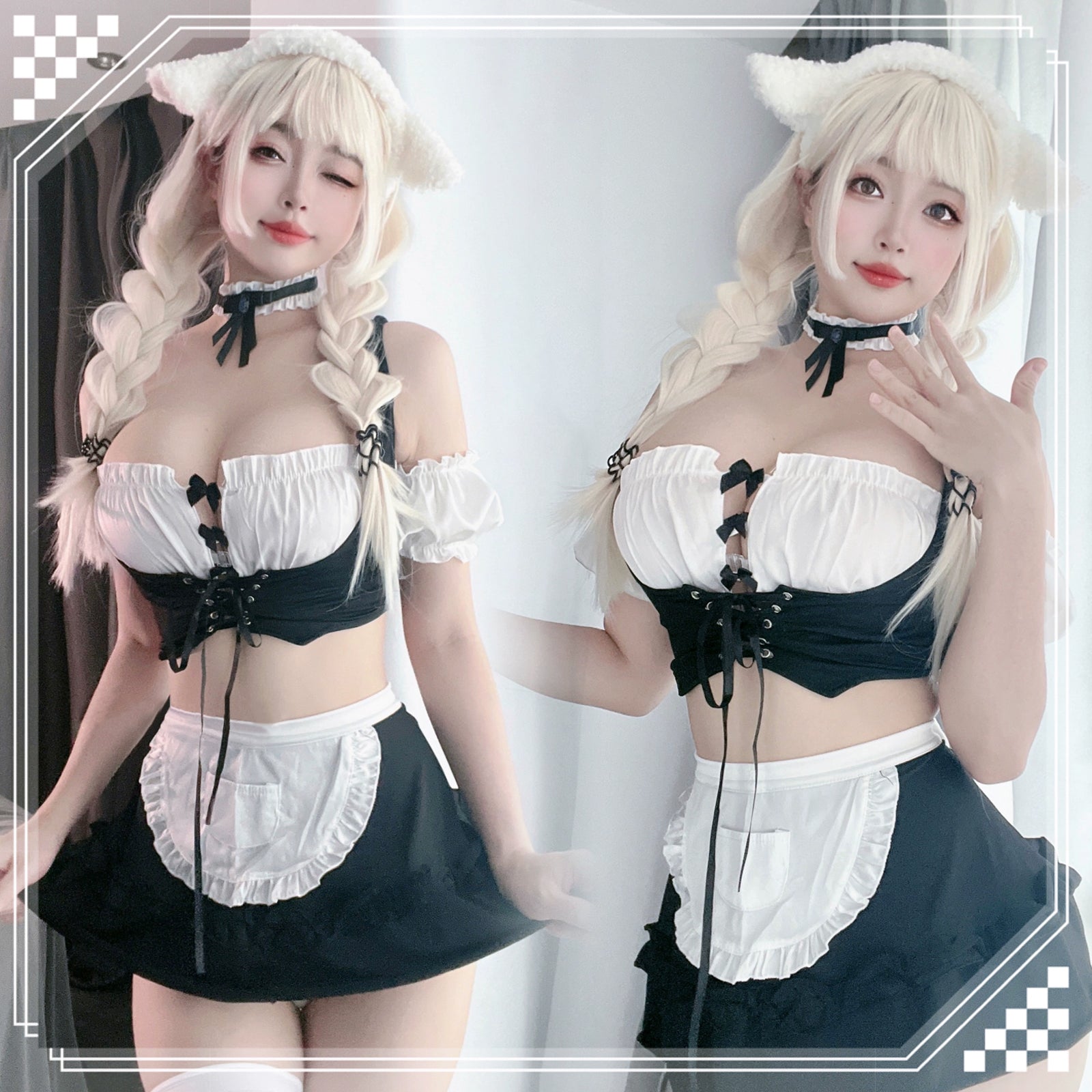Design: Slutty maid costume featuring a white bandeau top with short puff sleeves, a waist cincher panel with lace-up front detail, and a black mini skirt featuring a back slit design and tie closure, an attached apron, and flared ruffled hemline.