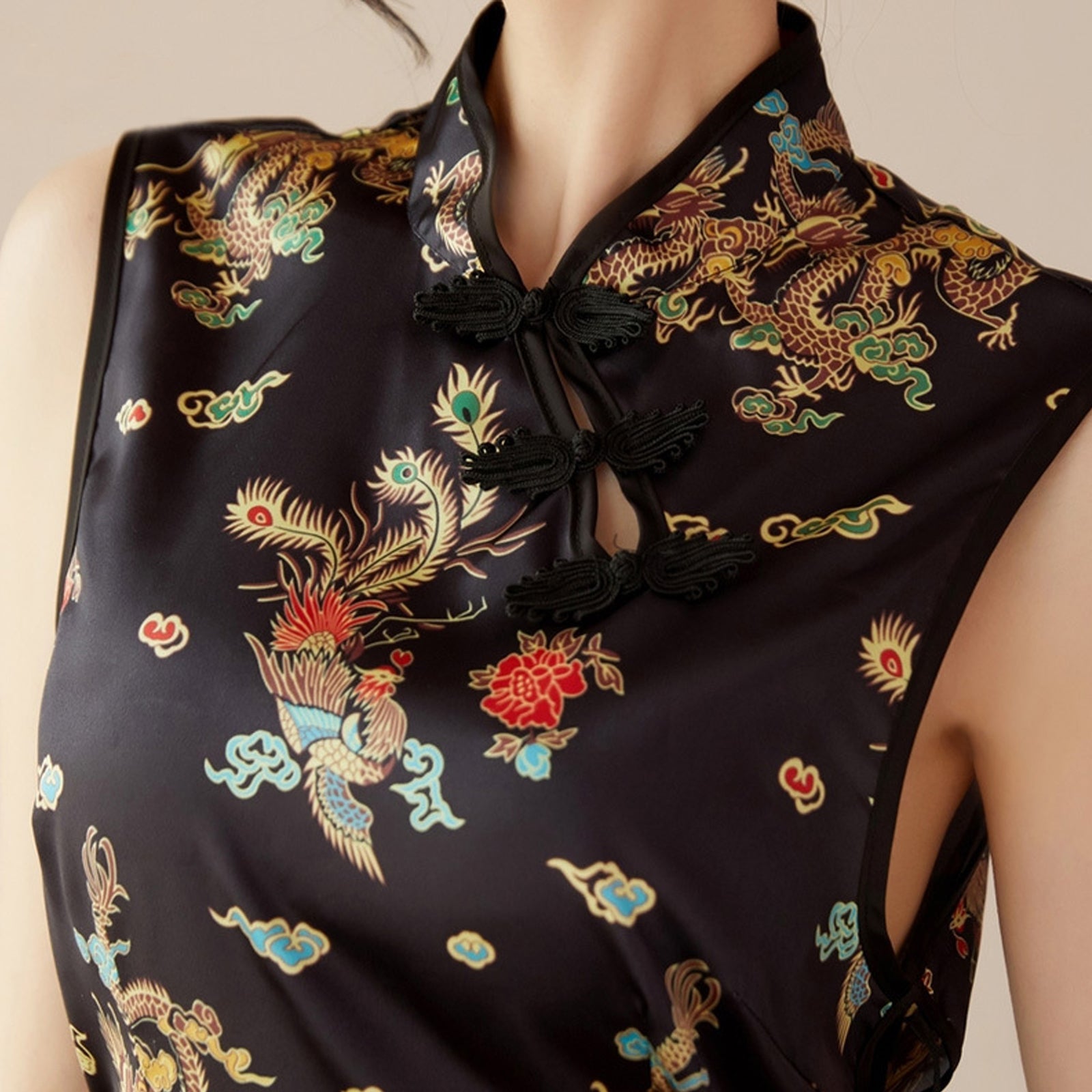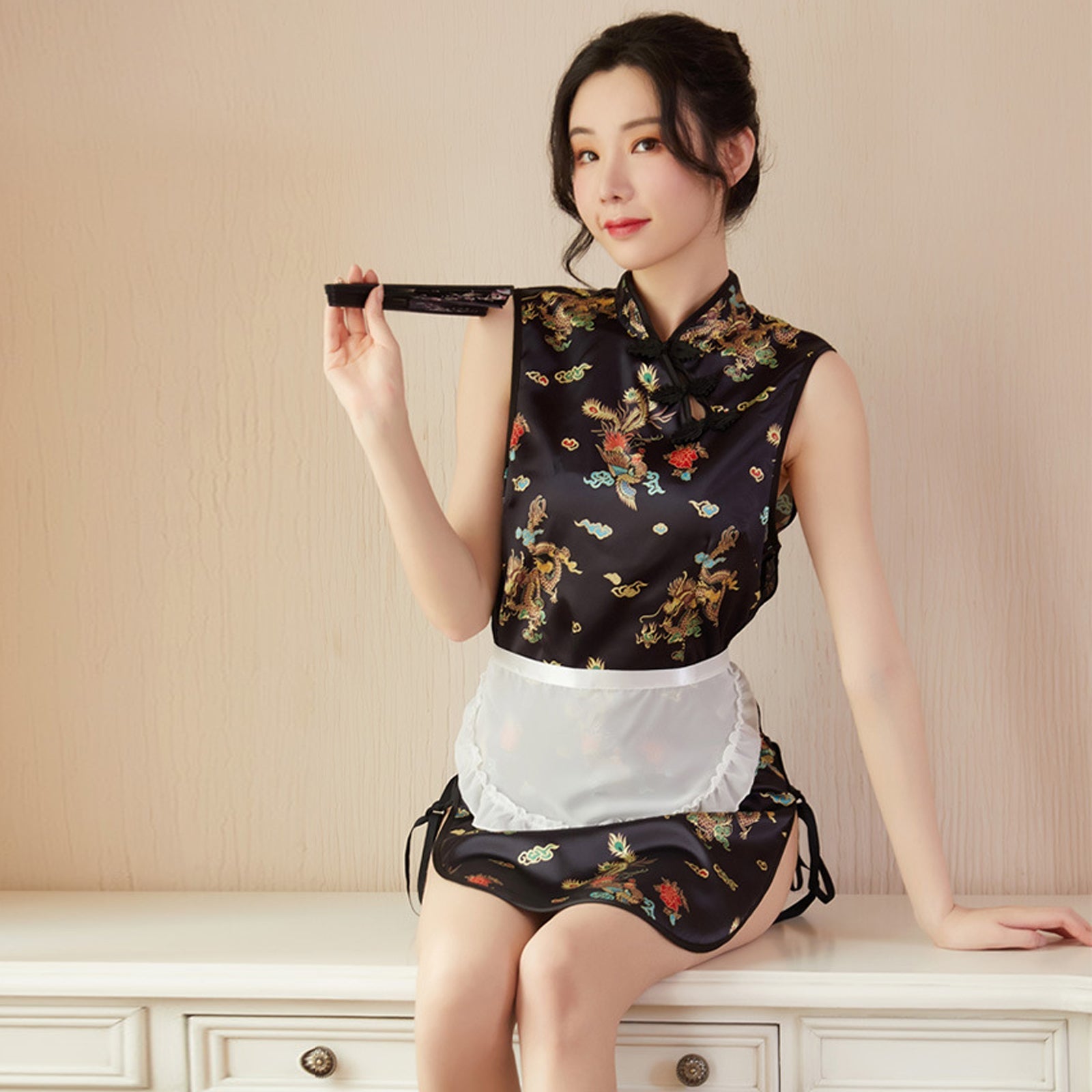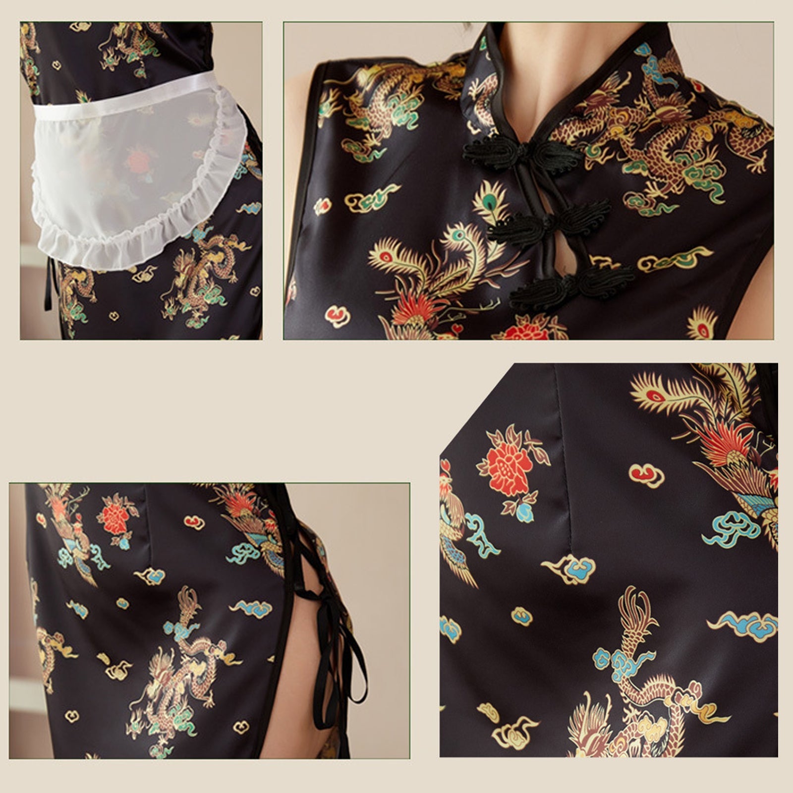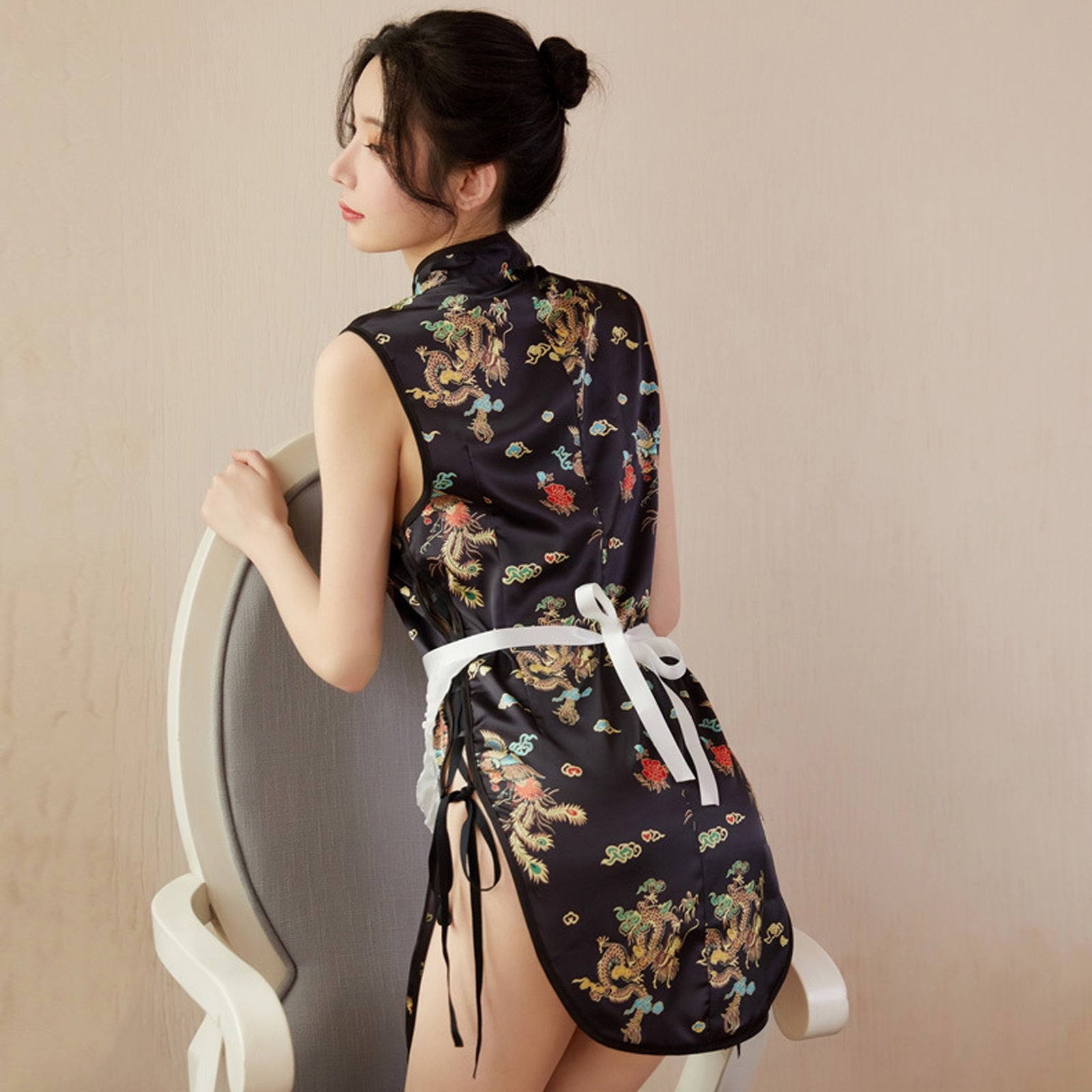 Design: Sexy Exotic Maid Dress featuring classic mandarin collar with traditional frog buckle closure, classic chinese dragon and phoenix pattern, white maid apron with a tie back closure, sexy sides slit with lace-up design allow it to fit more sizes, and a matching panty.