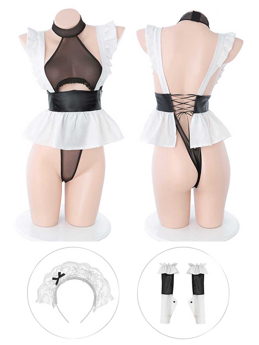 Design: Sexy Maid Cosplay Costumes featuring sheer mesh teddy lingerie witn pu leather panels, a halter neckline, a hollow out underbust opening, hook & eye closure crotch, back lace-up details, white ruffled trim at waist, and matching mesh sleeves.