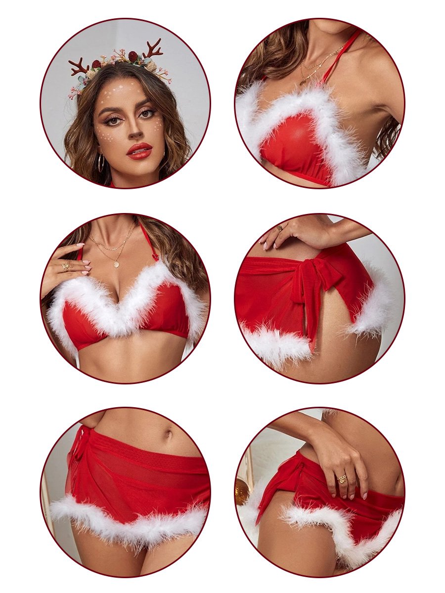 Design: Sexy Christmas Costumes for Women featuring a bra top with micro triangle cups, white fluffy trimming, halter neckline, an adjustable back strap, a matching mini skirt, perfect show your curve.